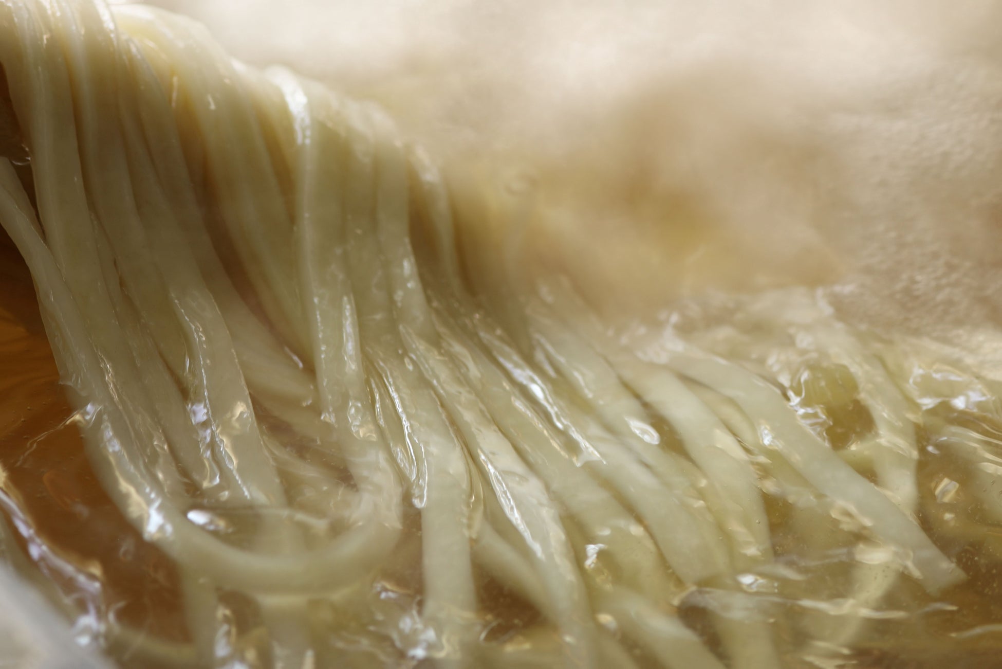 細く平たい独特の麺には、福岡県糸島産の貴重な小麦粉チクゴイズミを贅沢に使い、毎朝その日の分だけを製麺。冷と温で微妙に茹で時間を変えるなど細心の注意で、絶妙なしなやかさともっちり感を出しています。麺に合わせて、かつおやあごで濃いめにとられただしは力強い旨みが魅力です。もちろんFC新ブランド「はし田たい吉」でもおなじ味をお愉しみ頂けます。