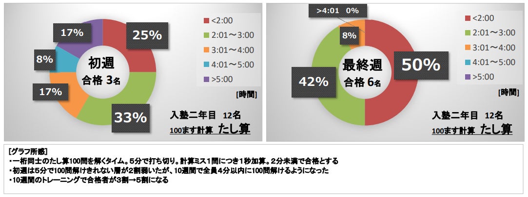 こちらは、100ます計算(たし算)を5分間行った時の結果です。入塾時には全員が5分で100問のたし算を終えられなかった子どもたちも、2年目になると半数が2分以内でできるようになってきました。