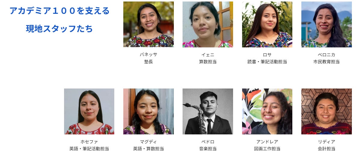 子どもたちの成長を支えているのは、現地スタッフの情熱と奮闘です。アカデミア100では、現在8名の講師と1名の会計スタッフがいます。これまで、現地スタッフの人件費は助成金により賄ってきましたが、助成金頼みでは持続可能な運営は難しいのが現実です。