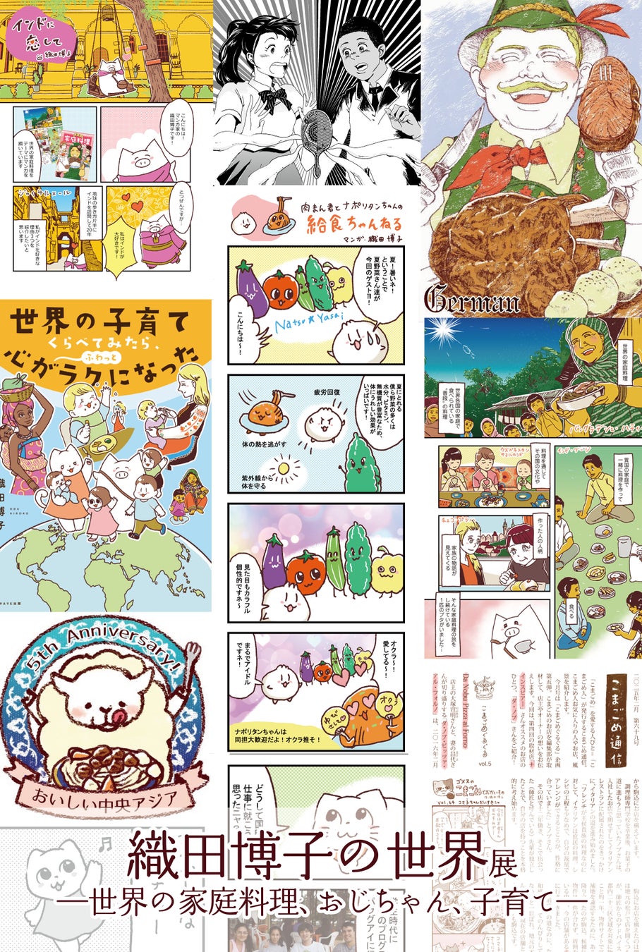 世界の家庭料理や暮らしを描いてきたマンガ家・織田博子の個展。イラストシリーズ『世界のおじちゃん』の代表作や新刊『世界の子育て くらべてみたら心がふわっとラクになった』の複製原画などを展示