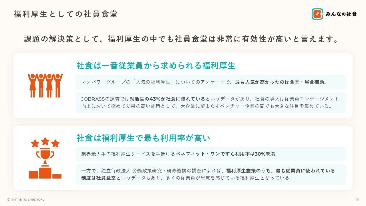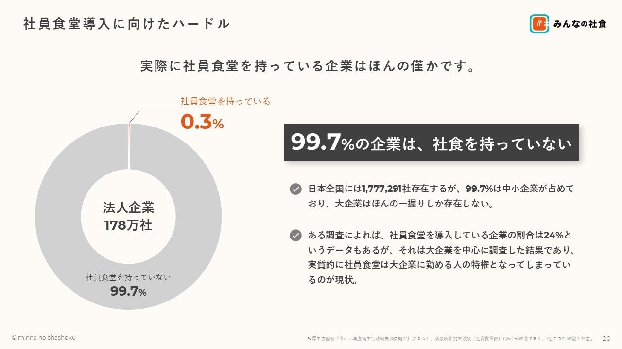 また、多くの企業がコスト面や社食の場所をつくるなど様々なハードルがあり、社員食堂を持っている企業は僅か0.3%しかありません。このような悩みを「みんなの社食」が解決します。