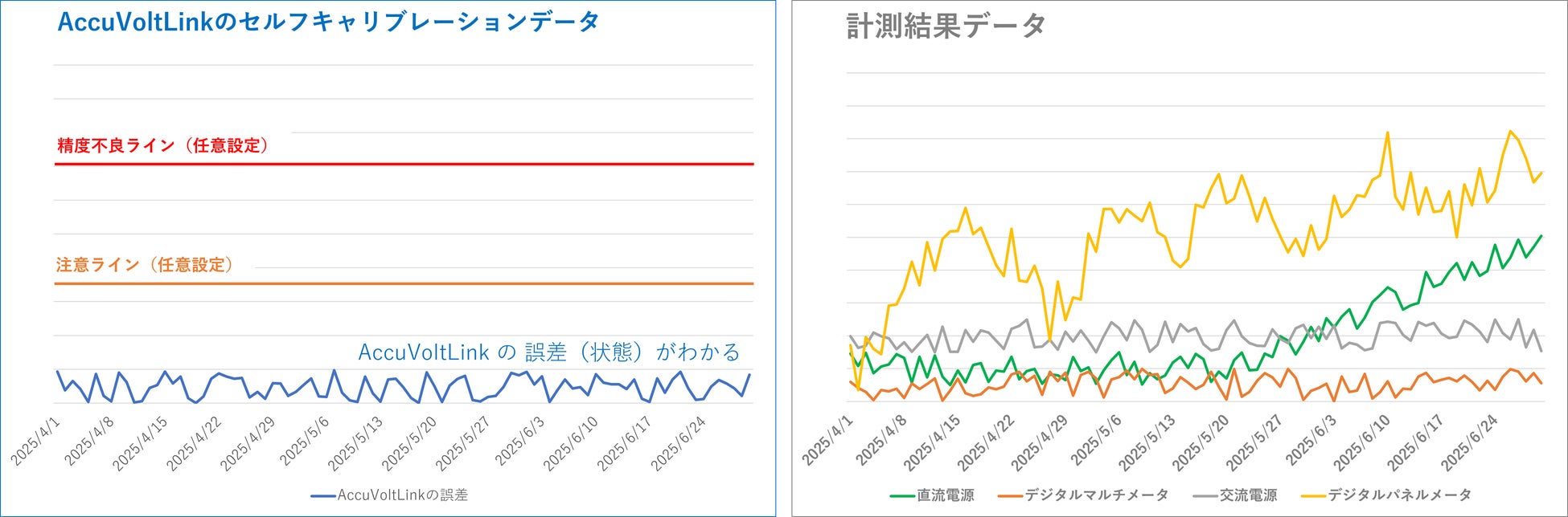 アキュボルトリンクの最大の特徴は、本製品(アキュボルトリンク)が自身の精度や誤差を自己診断できる点です。 一般的な計測器は内部の「基準電圧源」を基に動作や調整を行います。しかしこの基準電圧源がずれると、他の部品の精度や計測値も連動してずれてしまいます。つまり従来のセルフキャリブレーション機能は「内部の基準電圧源が正確である」という事が前提の機能でした。しかし「アキュボルトリンク」は、基準電圧源を含む電子部品のずれや劣化に起因する計測誤差にも気付くことが可能です。これにより、ユーザーは常に正しい状態の計測器「アキュボルトリンク」を使用できます。定期校正のみに頼るのではなく、日常的に正確な計測環境を維持し、計測品質と信頼性を向上させることが可能です。