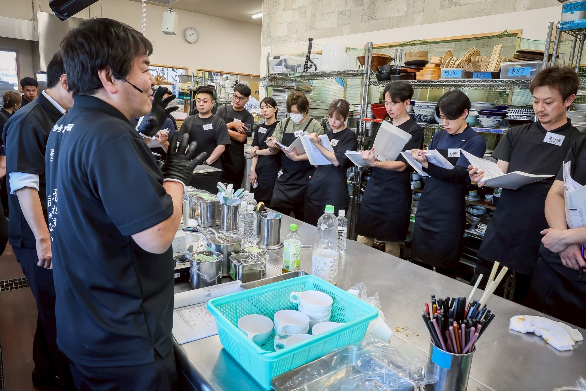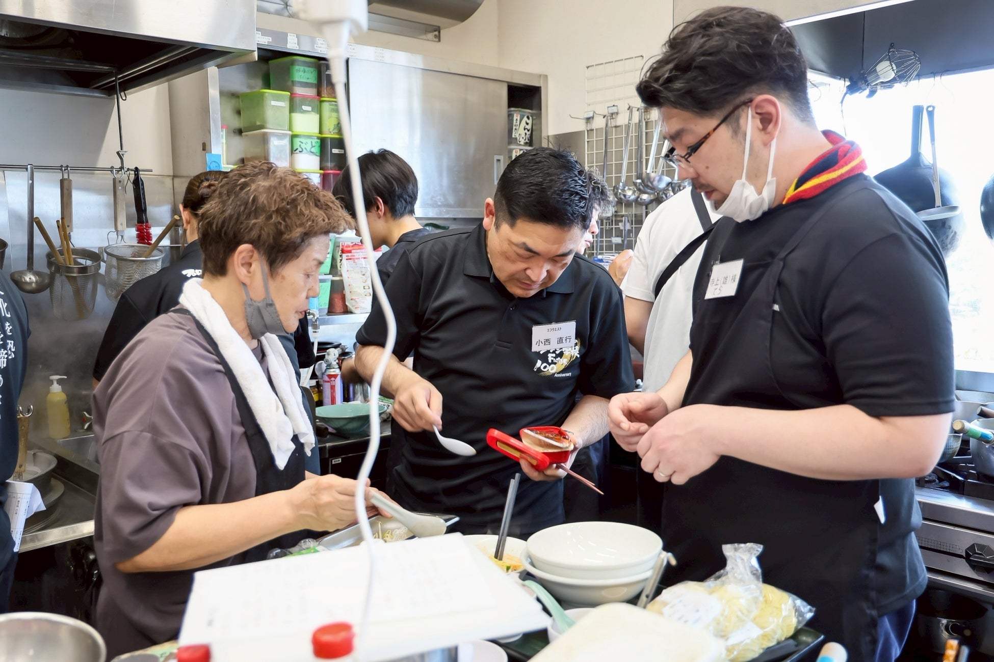『プロの為のラーメン学校』ファーストコースは、現役で繁盛店を経営する20人以上の卒業生や専門家から講義や実技講習を受けられる事が魅力で、100回記念となる今回は80人以上の卒業生がお祝いに駆け付け、それぞれの得意分野を活かし生徒指導にも加わりました。その中には大分県で麺堂香や太一商店を運営する株式会社ヤマナミ麺芸社・吉岩拓弥代表取締役、都内で吉祥寺武蔵家を運営する有限会社はっかにぶんのいち・藤崎茂也取締役社長、