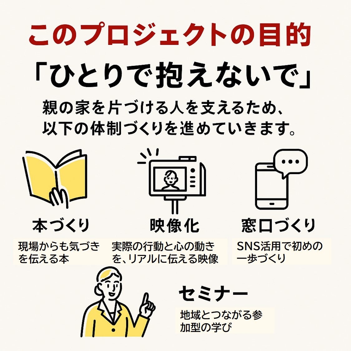 特に40〜60代にとって「親の家の片づけ」は、相続・介護・空き家の入り口になるリアルな問題。 しかし多くの人が、どう向き合い、どう始めればいいのか分からず、時間だけが過ぎていく…。そんな現実を解決すべく立ち上がります