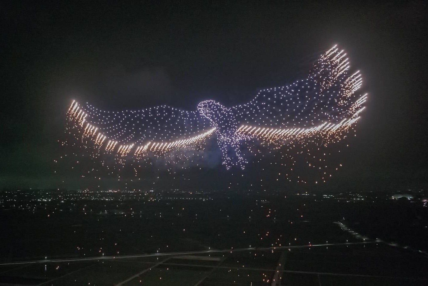 ドローンで描かれた「愛は勝つ」の楽譜と歌詞を見上げ大合唱。ブランド史上最大!の巨大オロナミンCも夜空に浮かぶ