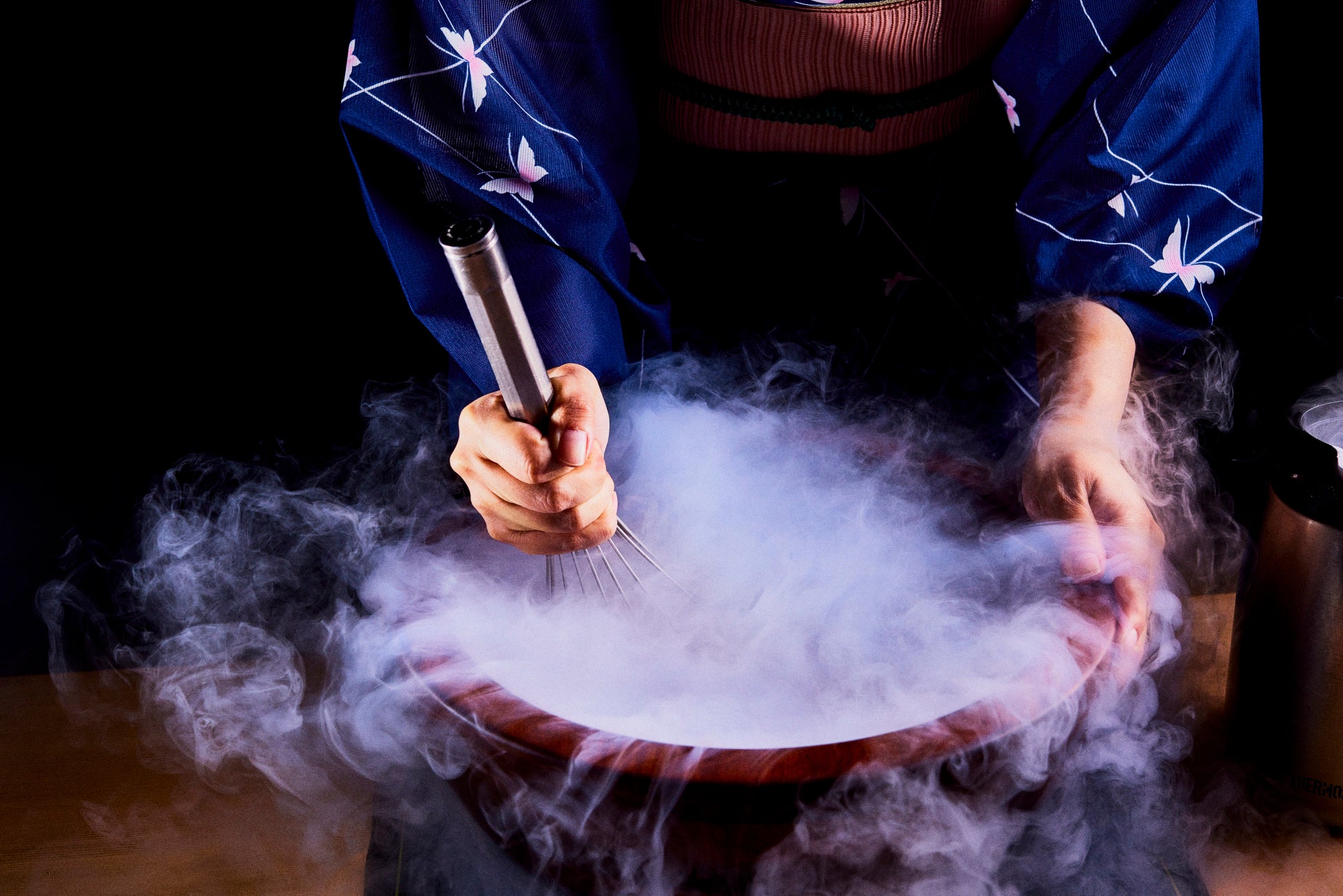お食事の〆には、のどごしの良い「五島うどん」をご用意。さらに、名物の液体窒素を使ったひんやり演出の氷菓が、五感すべてに涼を届けます。
