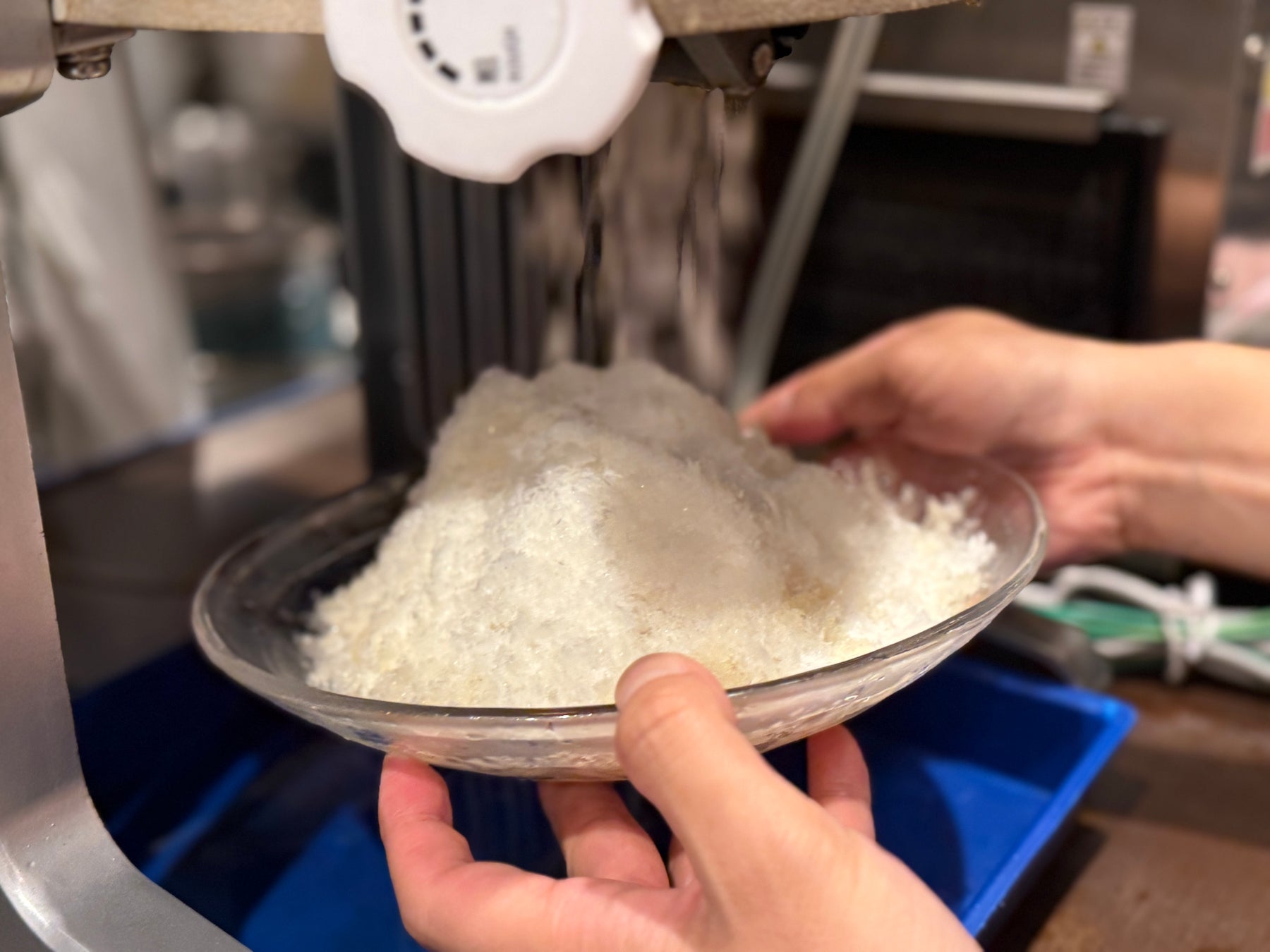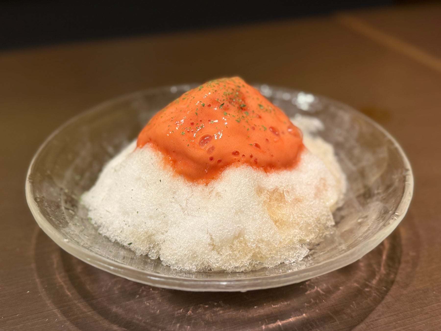 本商品には、かき氷専門店で使用される本格的なかき氷機を使用し、極限までふわふわに削られた白出汁氷を使用しています。口に入れた瞬間すっと溶ける、雪のような口溶けが、特性出汁とエスプーマの旨味をやさしく包み込みます。