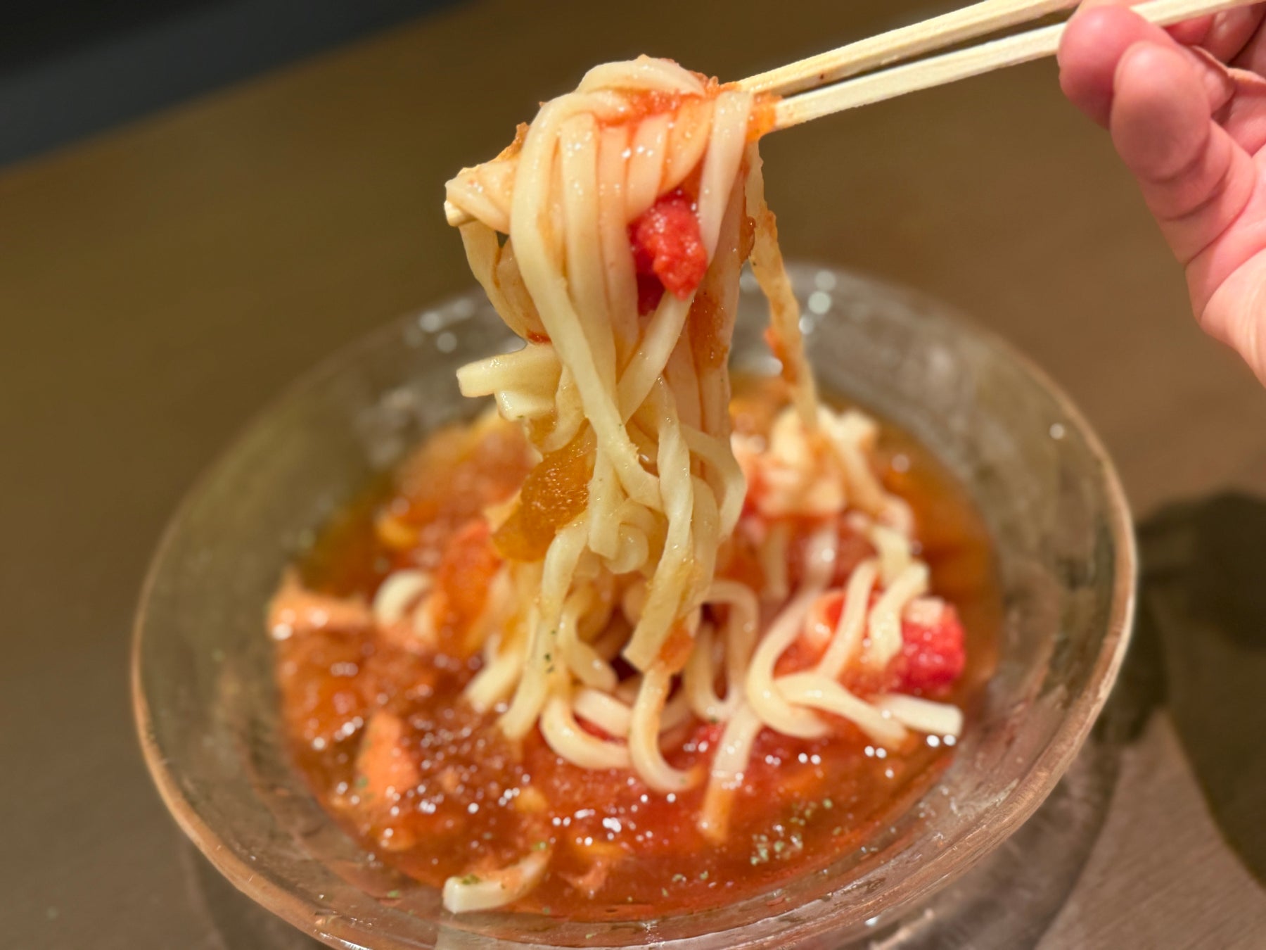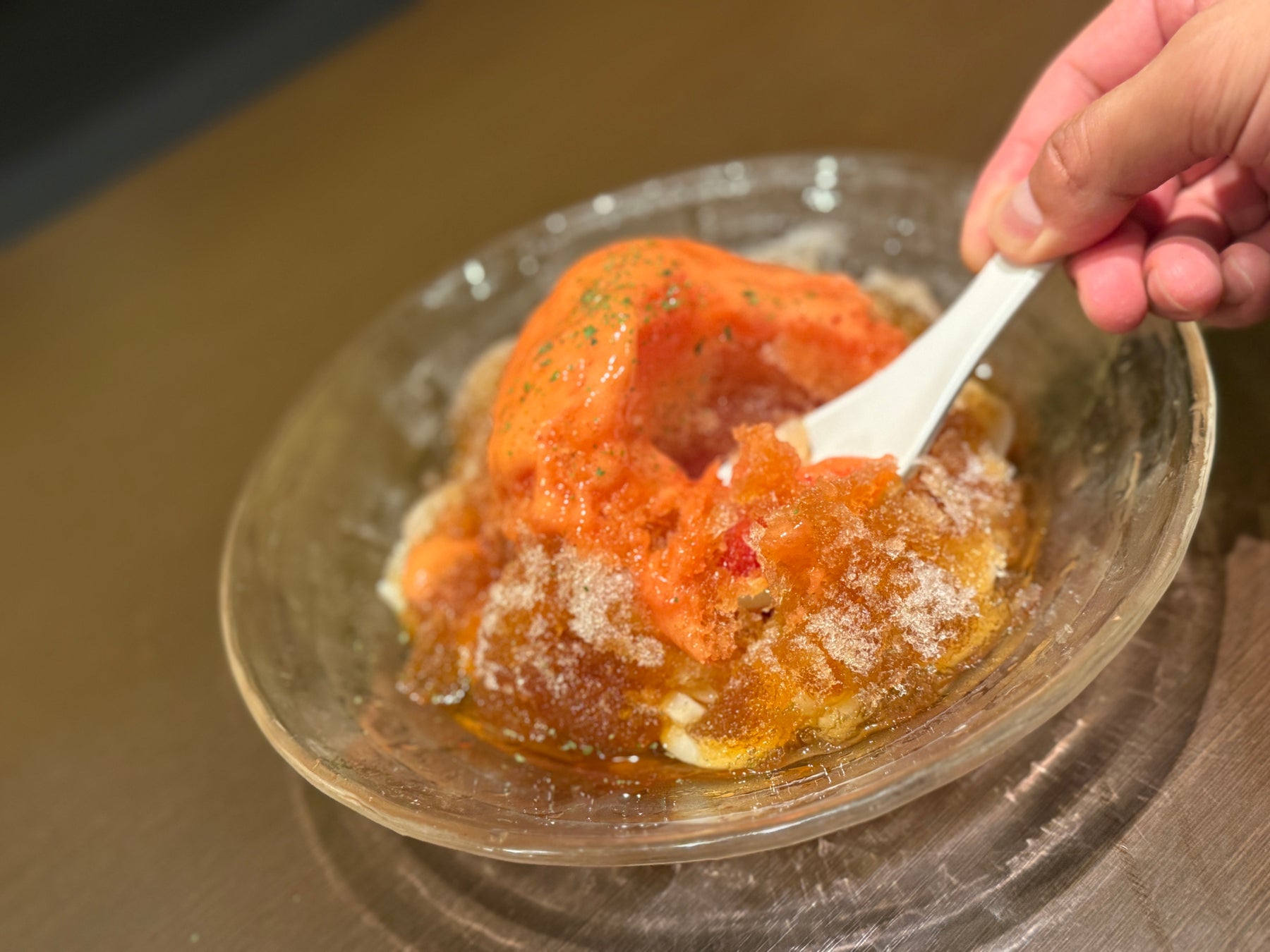 爽やかな酸味とともに味わいに深みをプラス。まるでスイーツのような見た目と裏腹に、口の中では出汁のうま味とトマトの酸味が絶妙に重なり合い、ひと口ごとに新しい驚きが訪れます。