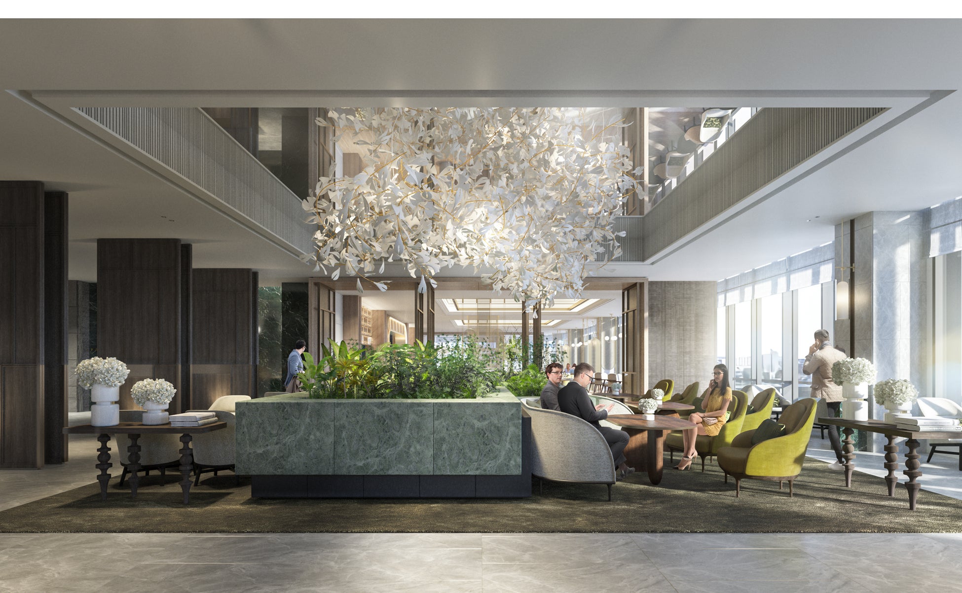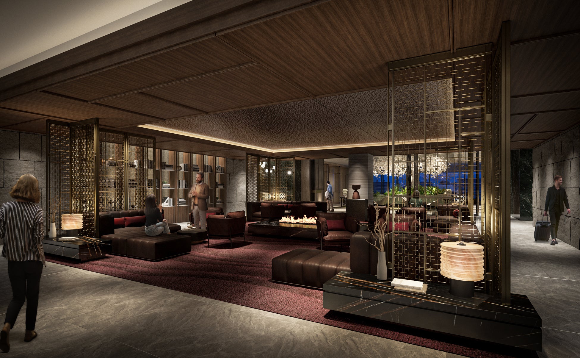 ラウンジエリアが連続的に広がり、日常を離れた静謐さと心安らぐ寛ぎが共存する空間を提供します。
