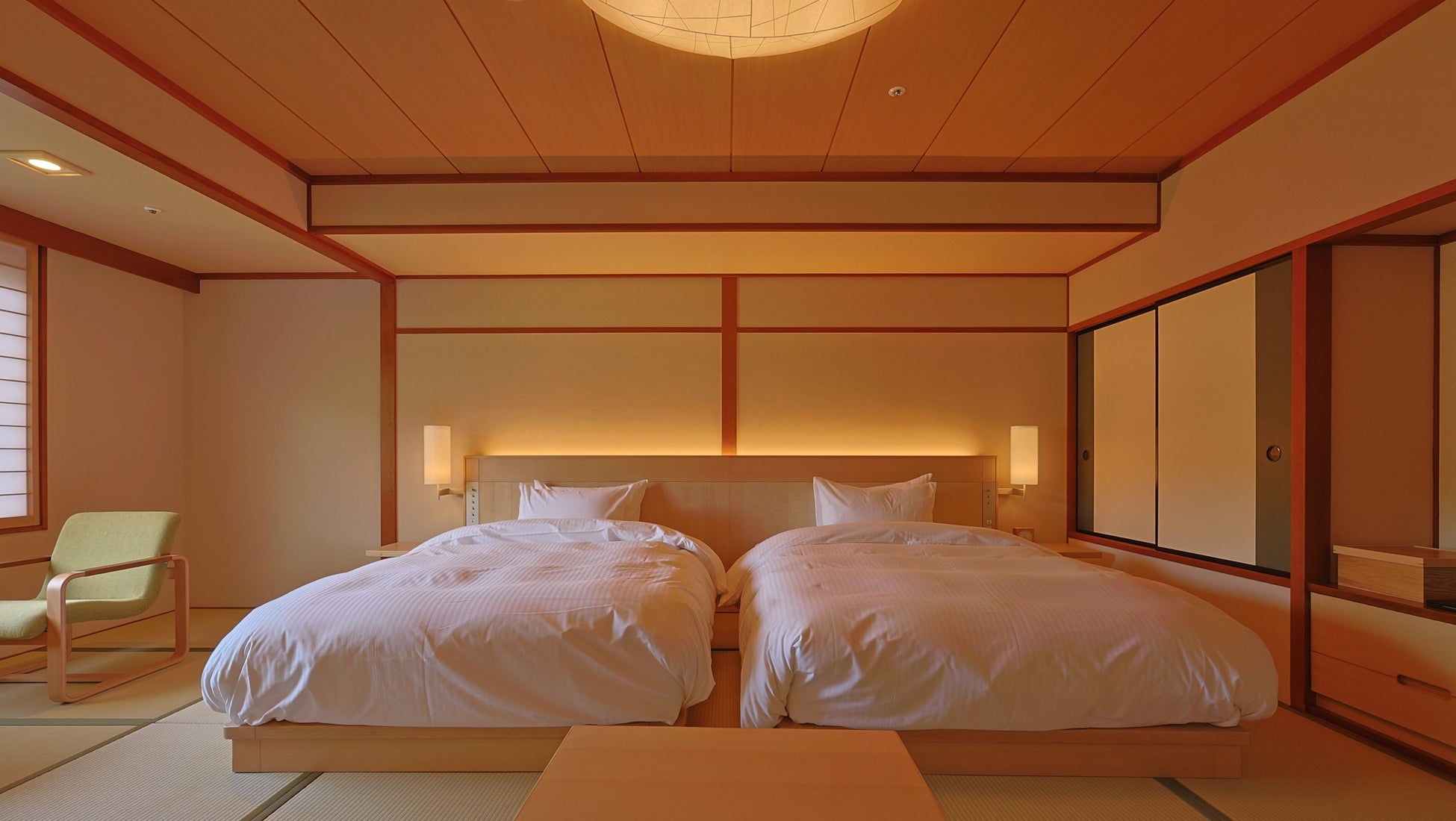 またベッド面の高さを40センチ以上に設定することで、ご高齢の方でも負担なく乗り降りしていただけるよう配慮しました。畳のため、靴を脱いで過ごすことができ、雲のような寝心地のベッドが旅の疲れを癒します。2025年7月19日より販売予定の「和室ガーデンデラックス」と「和室レイクビュースイート」の2つの客室は、ファミリーでも広々とお使いいただけるよう、マットレス2台を横並びに繋げて最大横幅280cmで利用できるようにしました。