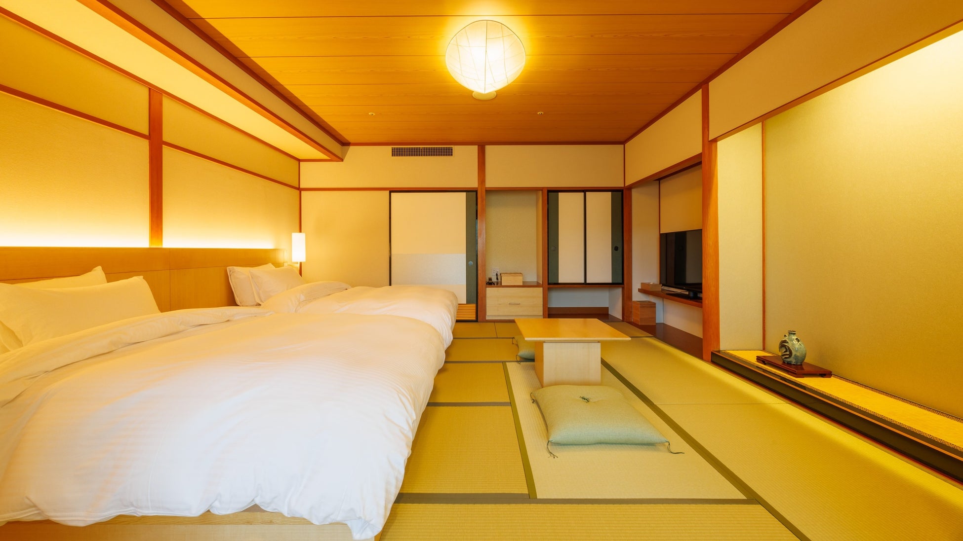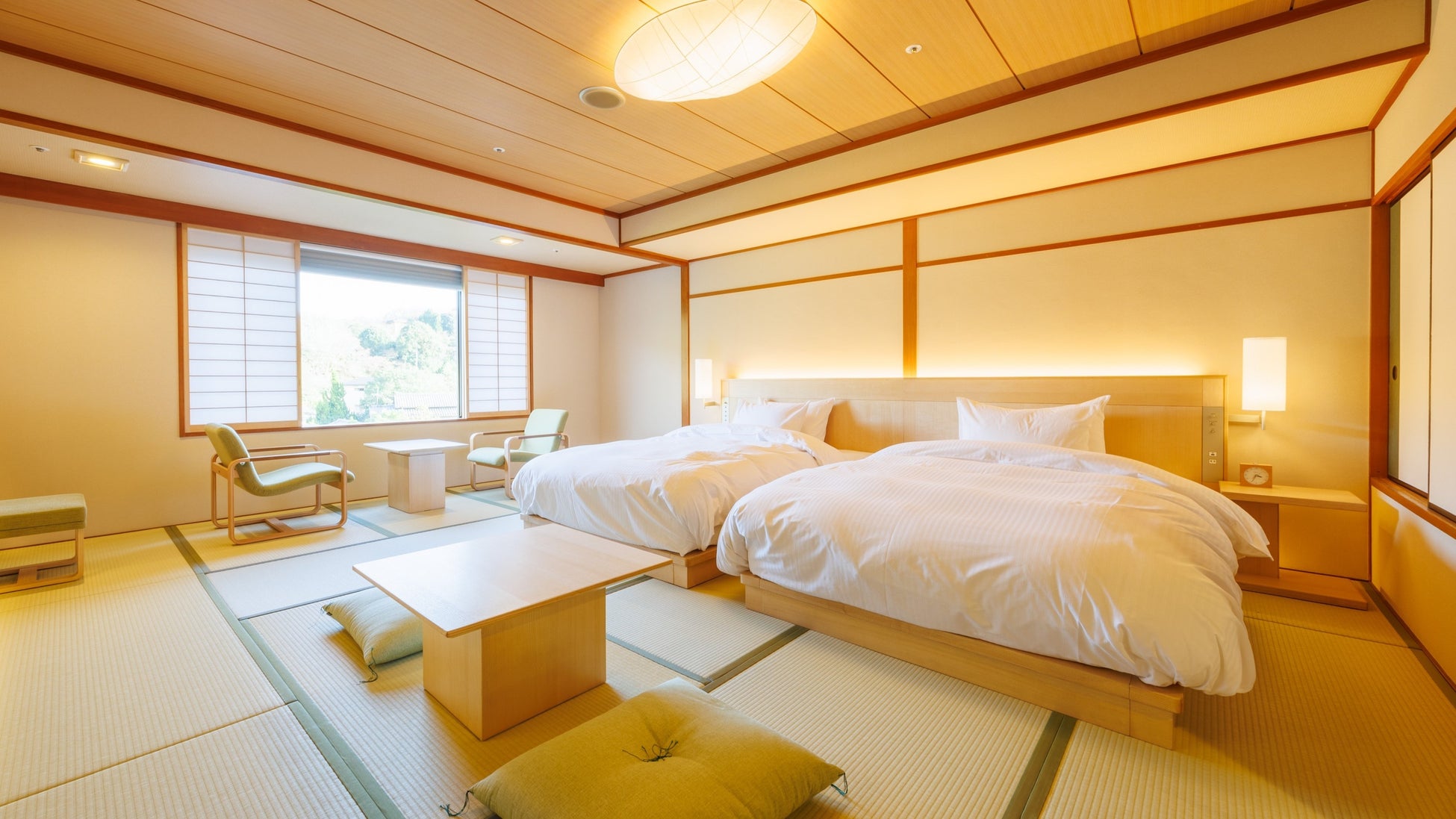 島根県松江市の名湯・玉造温泉で創業60周年を迎える温泉旅館「曲水の庭 ホテル玉泉」(所在地:松江市玉湯町、総客室数124 室)は、インバウンド需要の回復と多様化する顧客ニーズに応えるため、総客室の約6割にあたる76室と大浴場の大規模リニューアルを実施し、既に販売中の新客室に加え、2025年7月19日より最後の新客室の販売を開始します。今回のリニューアルでは、温泉やサウナ後に“整う”外気浴デッキ”や庭園を露天風呂に新設するほか、客室には、畳の上に、厚みのあるシモンズ社製ダブルベッド(幅140cm)を2台導入。“和モダン×グローバル水準”をコンセプトに、旅慣れた国内外の旅行者に上質な滞在を提供し、島根県の地域経済活性化に貢献することを目指します。