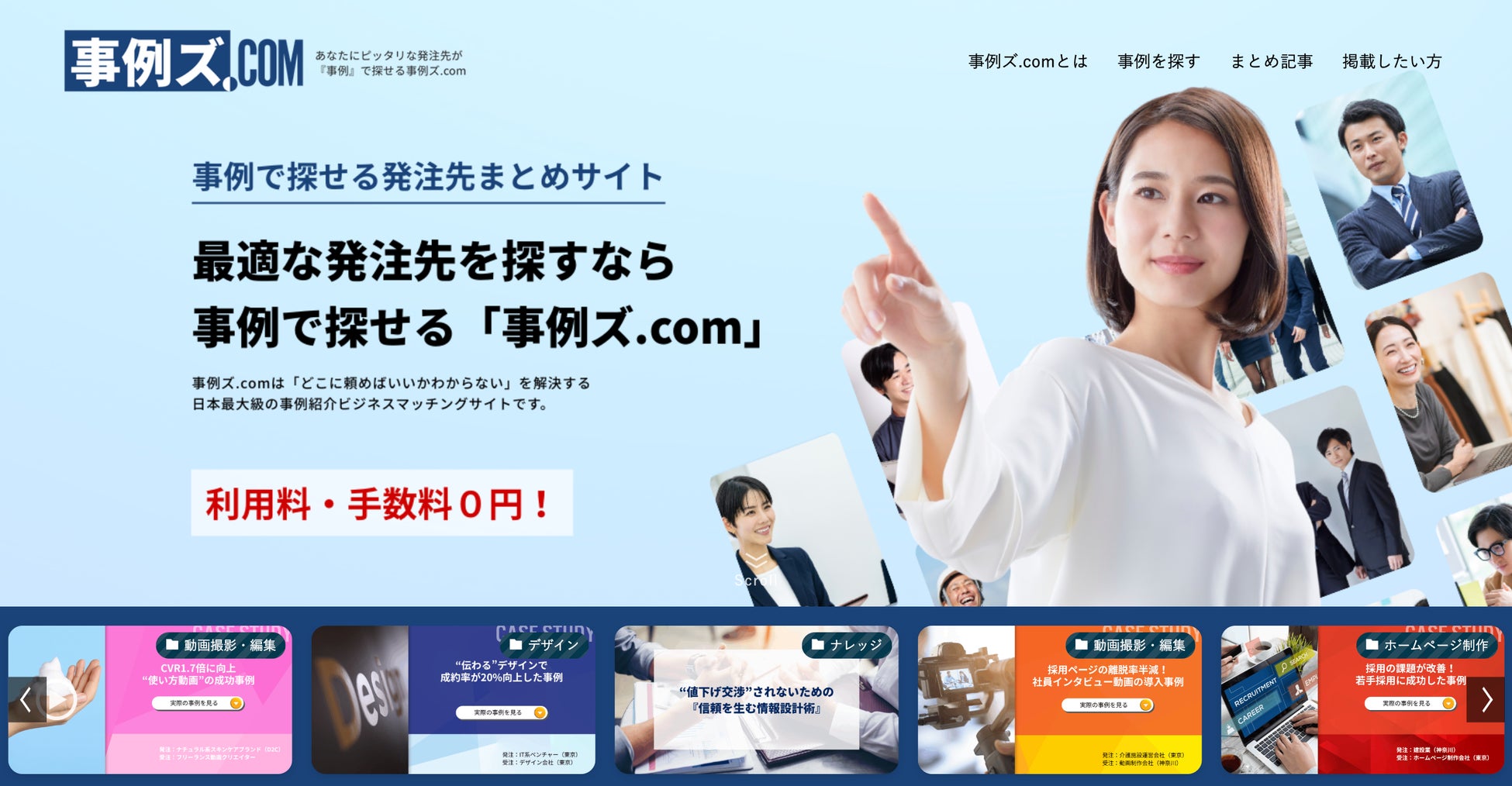 「事例ズ.com」は、ホームページ制作や動画編集、営業代行など中小企業に必要な各種サービスの発注先を、“事例から逆引き”で探せる新しい形のマッチングサイトです。