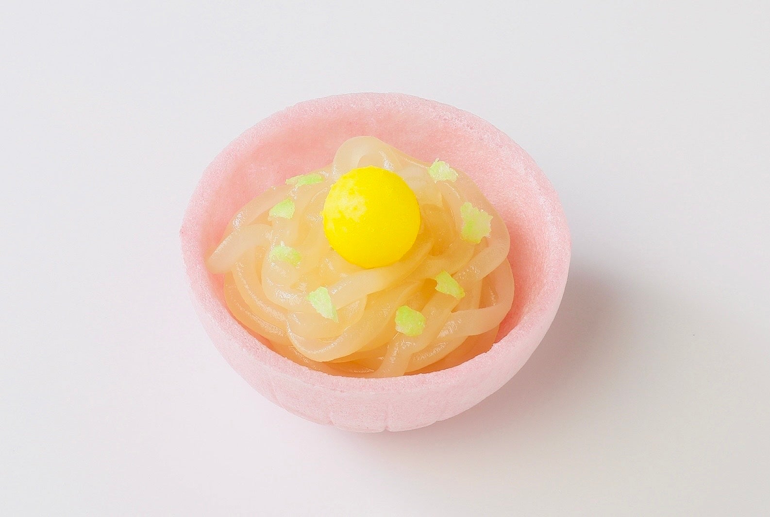 手のひらサイズのオリジナル丼型最中種(ピンク・水色・緑・紫の4色)に、白あんを盛り付けるだけで、まるで本物のうどんのような見た目に。さらに、香川の伝統的な嫁入り菓子「おいり」をトッピングすれば、ネギや卵に見立てた彩り豊かなビジュアルが完成します。