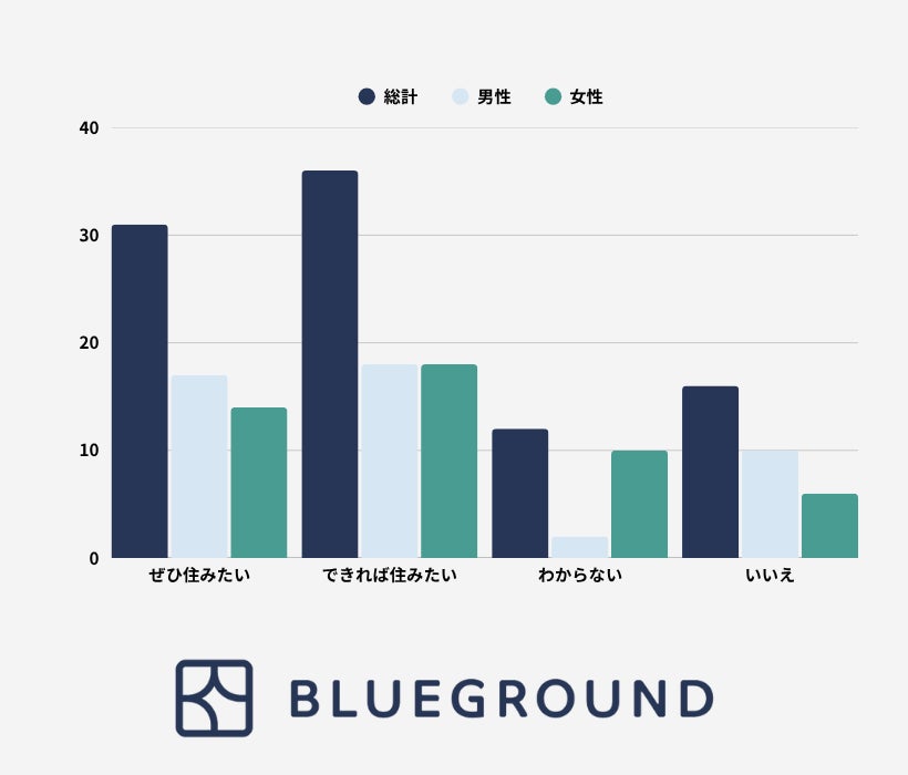 男性は「ぜひ住みたい」が約36%に対し女性は約29%と高く、女性は「わからない」が約21%と男性の約4%を大きく上回ります。