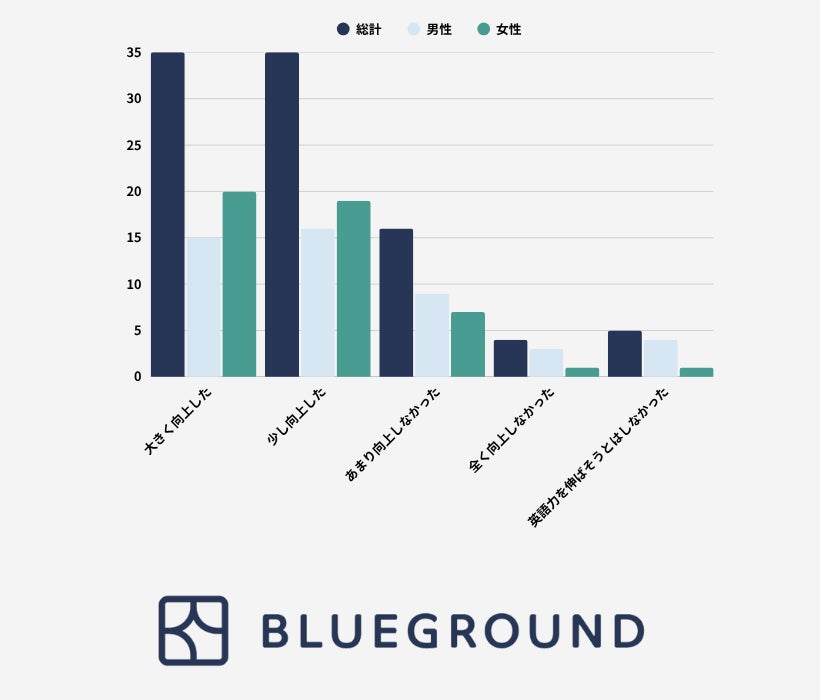 英語力が「大きく」または「少し」向上したと答えたのは約74%、「あまり」または「全く」向上しなかった人が約17%、「伸ばそうとしなかった」が約5%です。全体として、海外生活における英語力は一般的に向上傾向にあるようです。