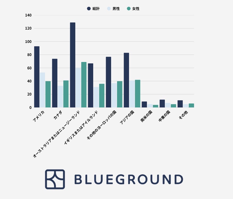 また、男性はアメリカ(約38%)を希望する割合が女性(29%)よりも高く、女性はカナダ(約30%、男性は24%)やオーストラリア・ニュージーランド(約51%、男性は44%)を好む傾向が見られました。これらの結果から、男女ともに英語圏の西洋諸国を好む傾向があるものの、男性はアメリカ、特にニューヨークのような都市を好む傾向があり(ニューヨークでは家具付きアパートの需要が引き続き増加している)、一方で女性はカナダやオーストラリア、ニュージーランドを好む傾向があることが分かります。