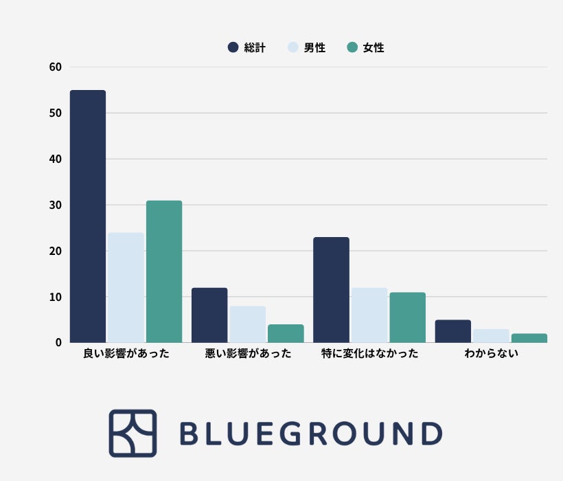 女性は良い影響を感じた割合が約65%と男性の約51%を上回り、男性は悪い影響を感じた割合が約17%と、女性の約8%より高くなっています。