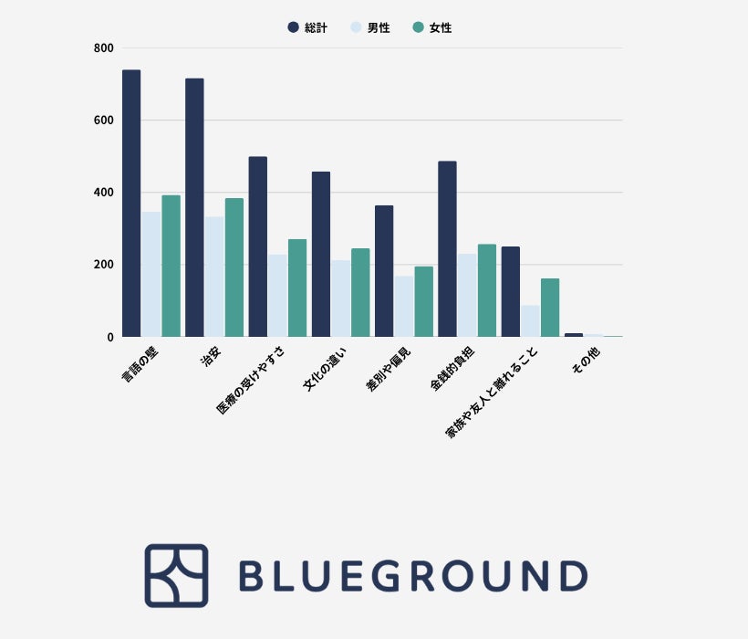 また、ほとんどすべての項目において、女性の方が男性よりも高い割合で不安を感じていることがわかりました。特に、「家族や友人と離れること」(女性32.4%、男性17.6%)と「言語の壁」(女性78.6%、男性69.4%)では大きな差が見られました。その他、「治安」(女性76.8%、男性66.6%)、「医療の受けやすさ」(女性54.2%、男性45.8%)、「文化の違い」(女性49.0%、男性42.6%)、「差別や偏見」(女性39.2%、男性33.8%)、「金銭的負担」(女性51.4%、男性46.0%)においても、女性の方が高い割合を示しています。