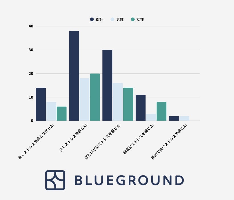 女性は「非常に強い」または「極めて強い」ストレスを感じた割合が約18%と男性の約4%を大きく上回り、その他のストレスレベルは男女でほぼ同様です。