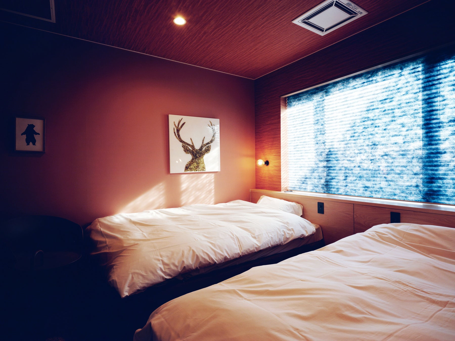 「ATUY(アトュイ)」:朝日の差し込む釧路の海の航海をイメージした特別な空間で、かつての院長室をリノベーションしたお部屋です。吹き抜けのメインホールを見下ろすことができ、毛綱氏による貴重な版画2点も展示されています。