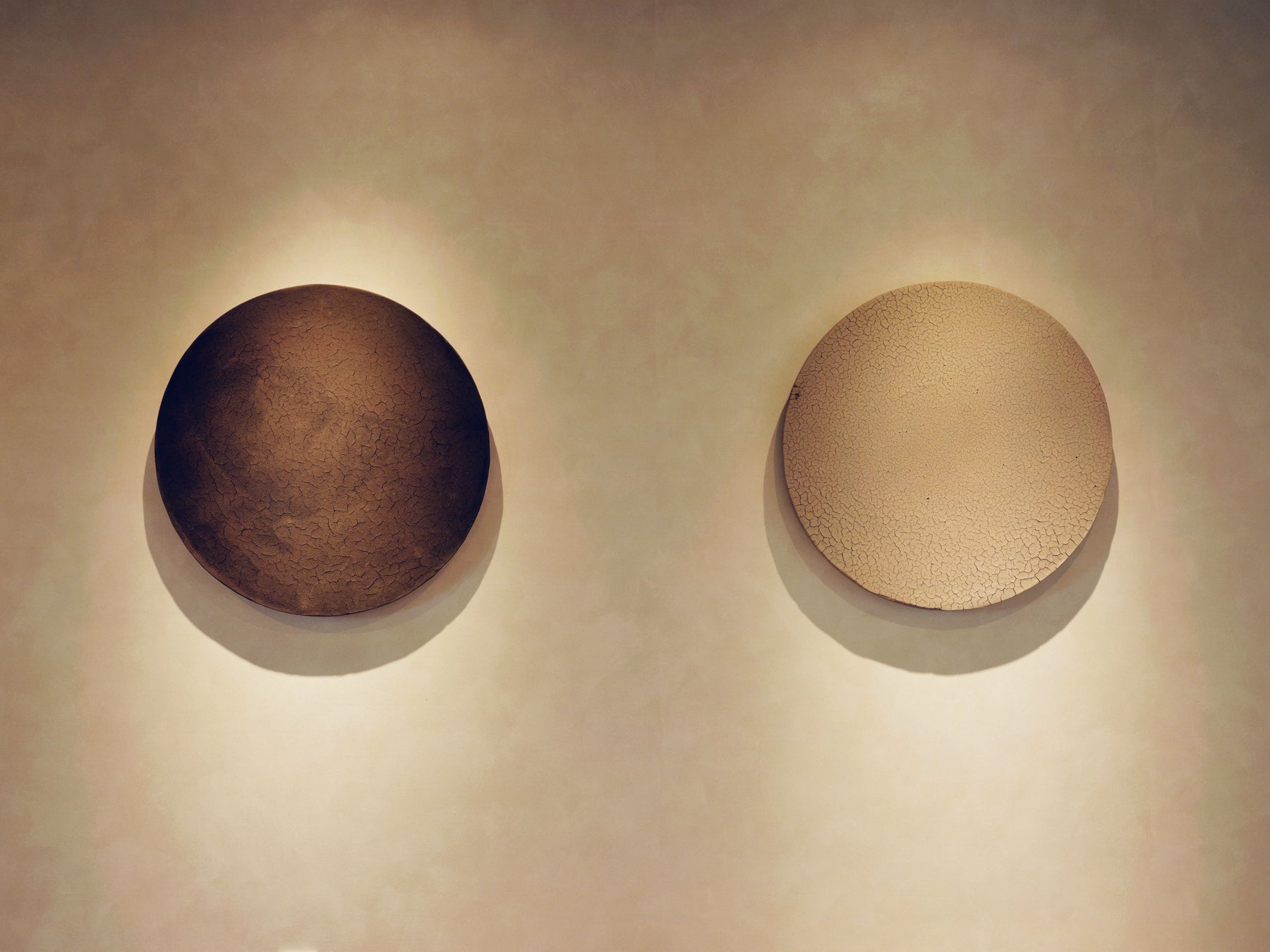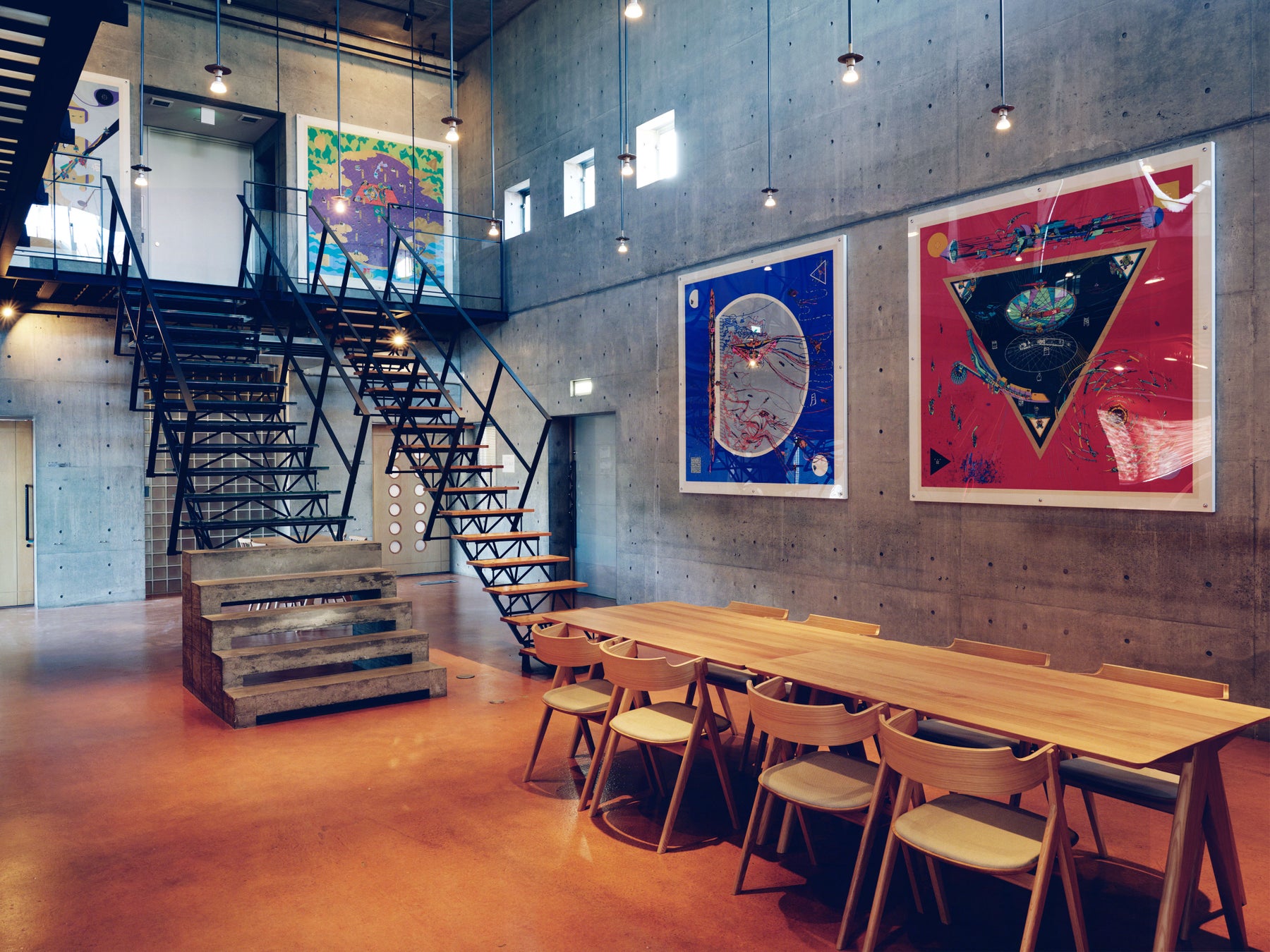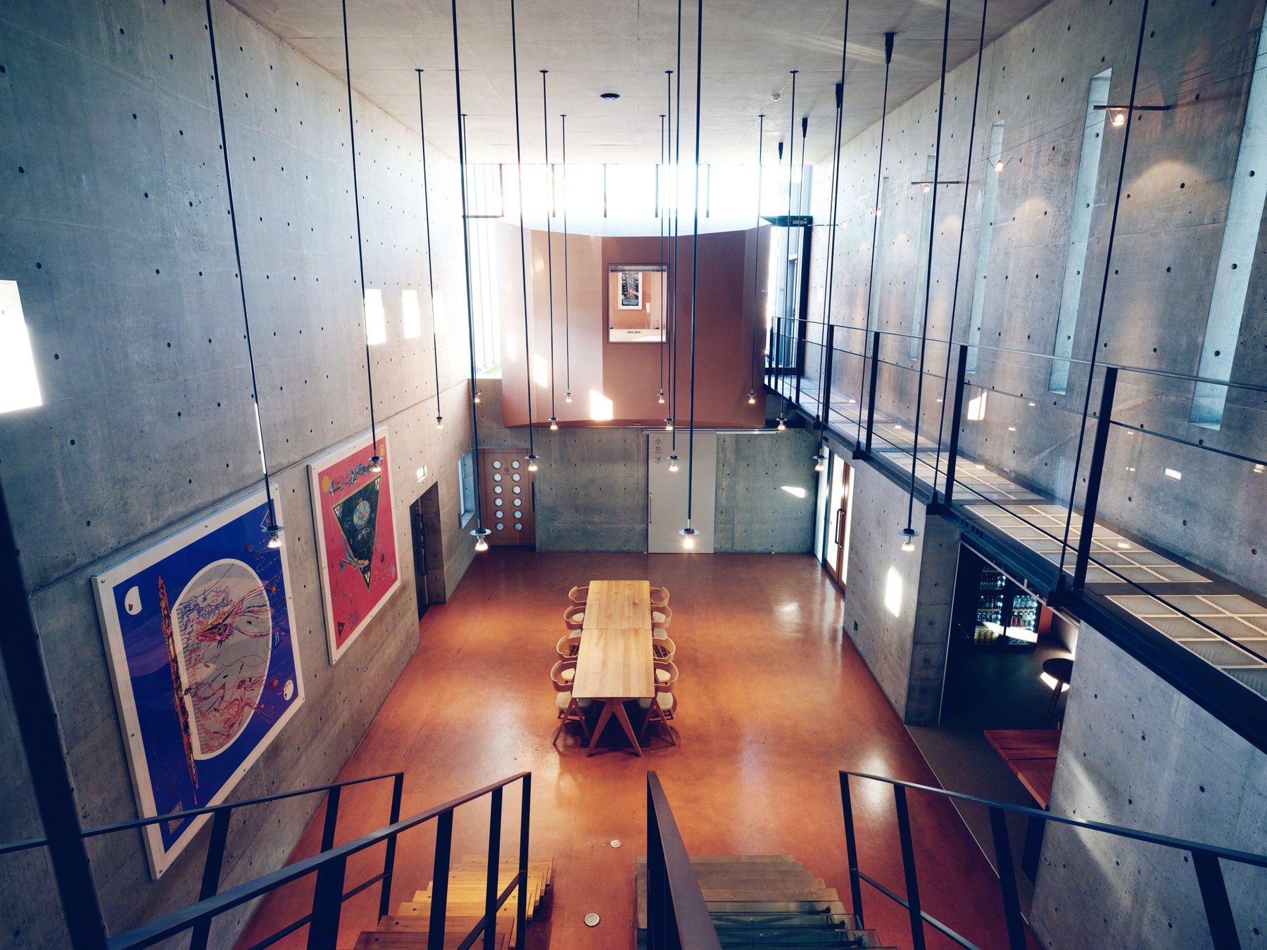 吹き抜け構造のメインホールは、かつてミニコンサートや文化イベントが開かれていた歴史ある空間。コンクリート打ち放しの壁面や高天井が印象的で、毛綱氏の代表作『建築古事記-曼荼羅-』シリーズを含む多数のアートが展示されています。