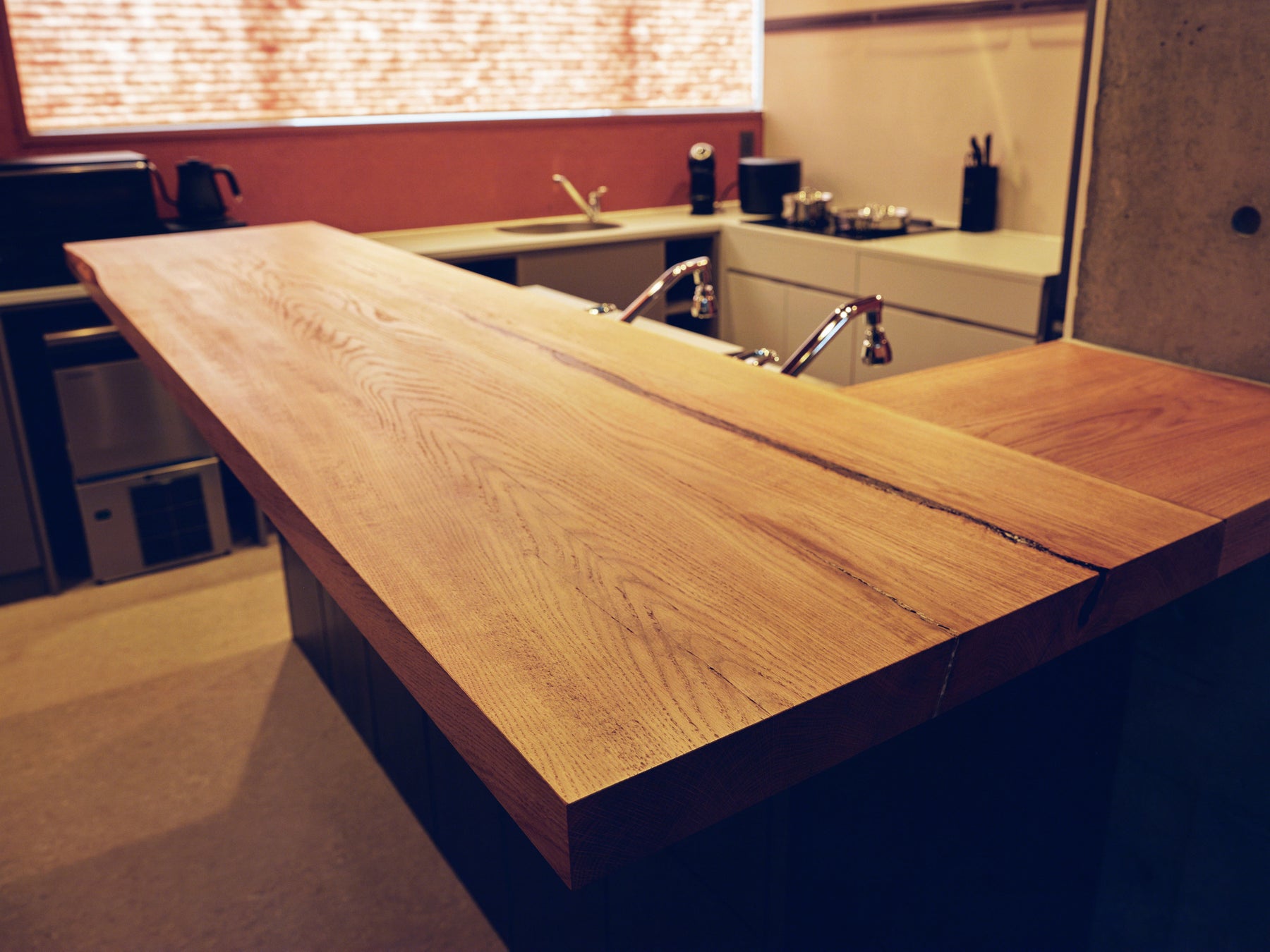 キッチンは釧路湿原の土を素材にした土塗り壁で彩り、カウンターは北海道産の天然一枚板で制作。キッチンも地域素材にこだわりました。広々としたキッチン内にはコンロ×2、作業スペース、シンク×3、冷蔵庫、食器洗い洗浄機などが完備。食材を持ち込んで大人数でお料理をして、ホームパーティーのように楽しむことができます。