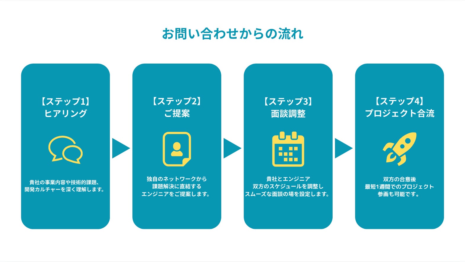 長期化する正社員採用と異なり、最短1週間程度でのプロジェクト合流も可能であり、必要なスキルを必要な期間だけ活用できるため、事業のスピードを落としません。