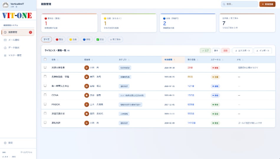 期限更新を確実に、3段階(緊急/注意/余裕)でお知らせ。