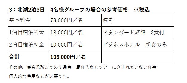 ①各プランにはサービスの内容、および宿泊や食事代以外のツアー料金等が掲載されています。