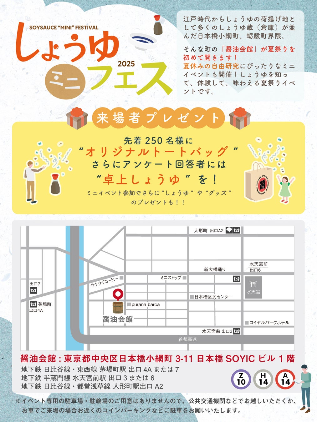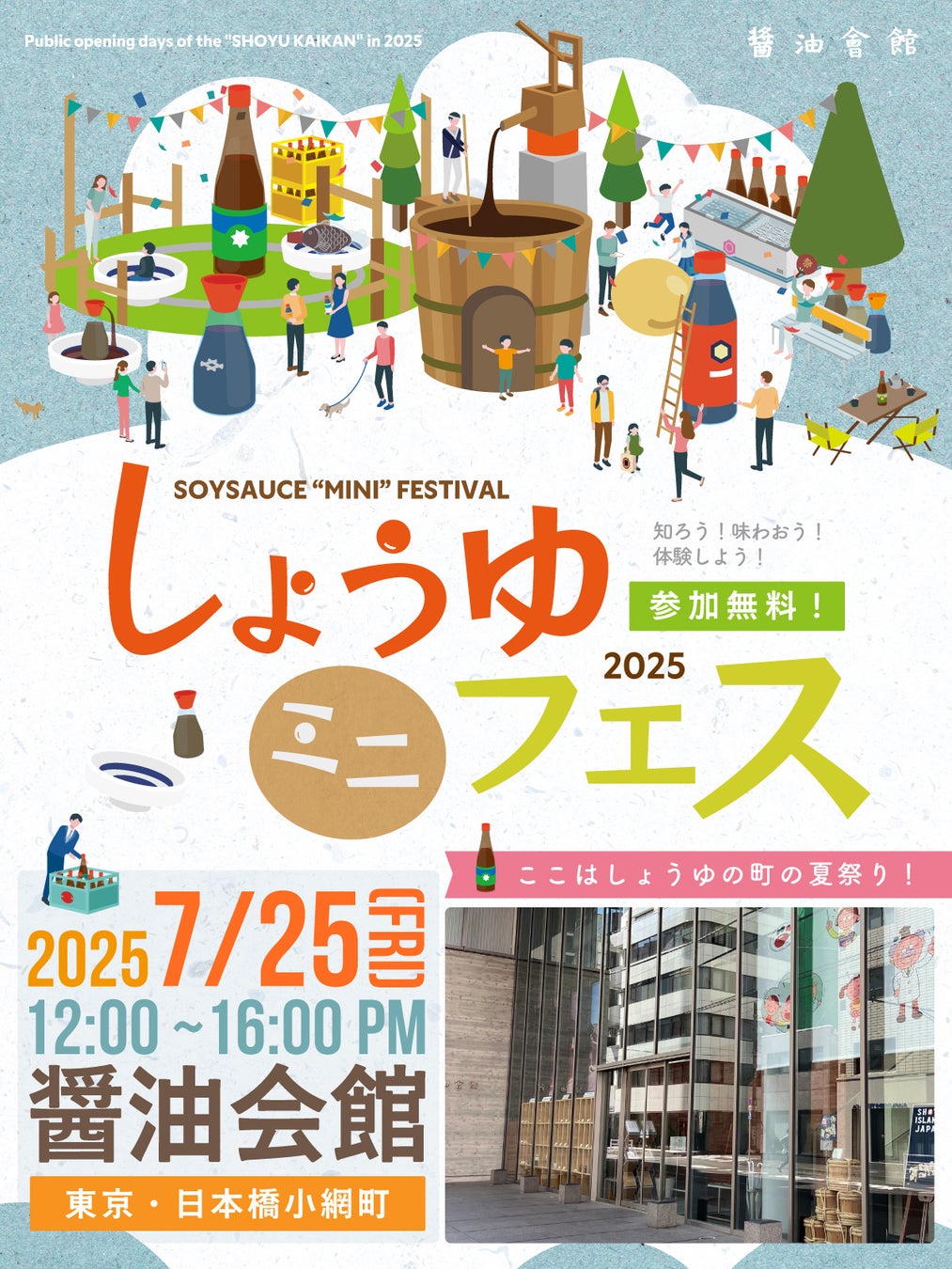 日本醤油協会(会長:堀切功章)は、全国の醤油製造販売者で構成する団体です。このたび、本協会がある醤油会館を知って頂き、しょうゆに触れる機会をご提供する初のとりくみとして「しょうゆミニフェス」を開催します。当日は、多彩な体験コーナーや参加賞をご用意し、皆さまのご参加を心よりお待ち申し上げております。