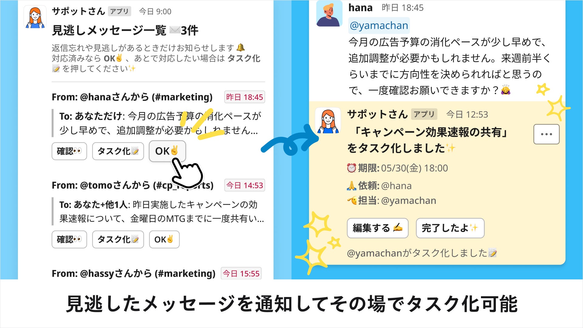 Slack上で見逃したメッセージをDMでまとめて配信。すぐ対応できない場合は配信メッセージからタスク作成も可能