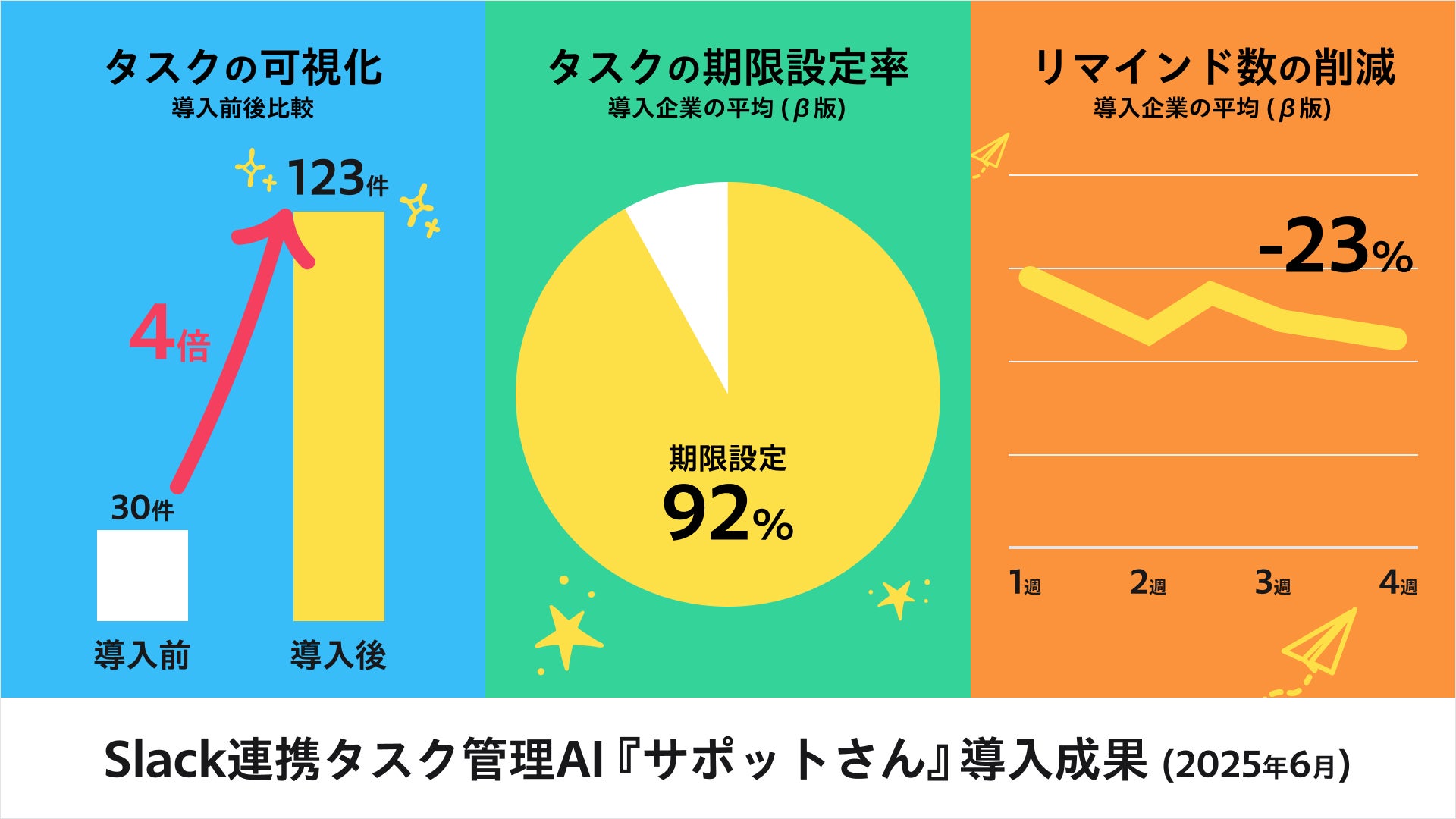実際の導入企業では、1ヶ月間で一人あたりのタスク作成数が導入前の約4倍(30件→123件)に増加。「埋もれ依頼」をSlack上で可視化したほか、期限設定率は平均92%、リマインド業務の23%削減を達成しました(2025年6月現在、β導入企業4社平均)。