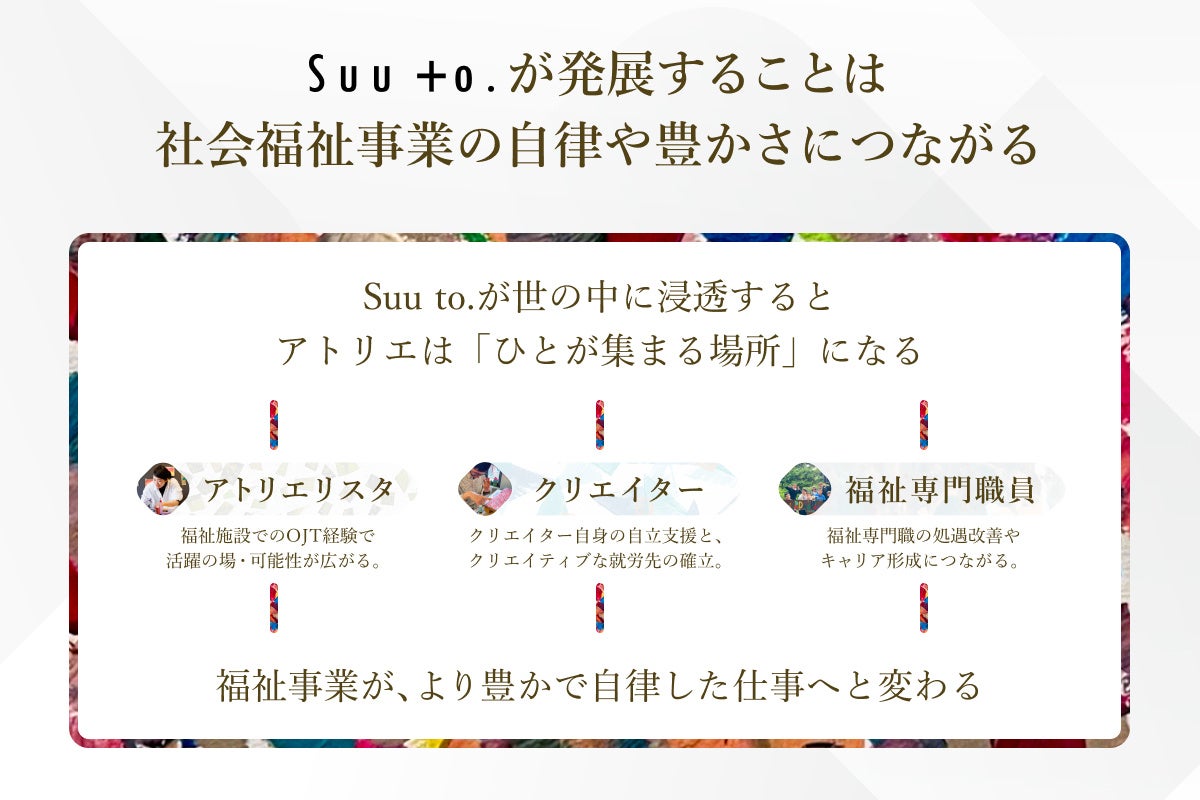 Suu to.とは、軽井沢のアトリエを舞台に、福祉とアートの力を重ね合わせ、障害があるクリエイターの才能に光を当て、支援員とともに、丁寧に生み出される透明な感受性にあふれる作品を、社会へ届けます。具体的には作品の販売・レンタル、企業・ブランド・個人様とのコラボレーション企画、オリジナル商品のEC販売になります。その対価はクリエイターや支援員、この活動を育む空間へと巡り、一人ひとりが、自らの可能性を信じて歩んでいける豊かな社会へと還元されていきます。