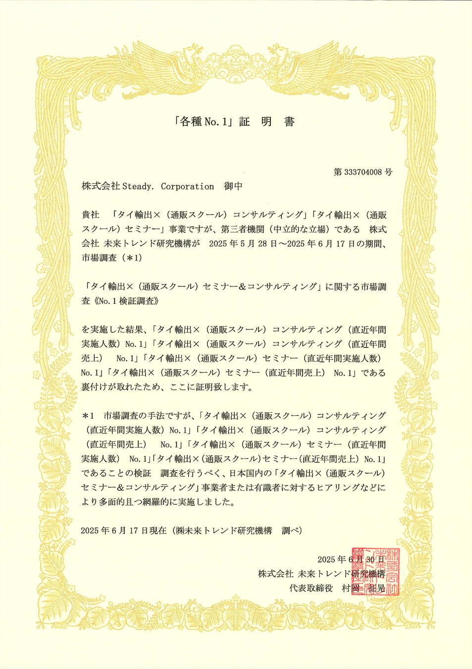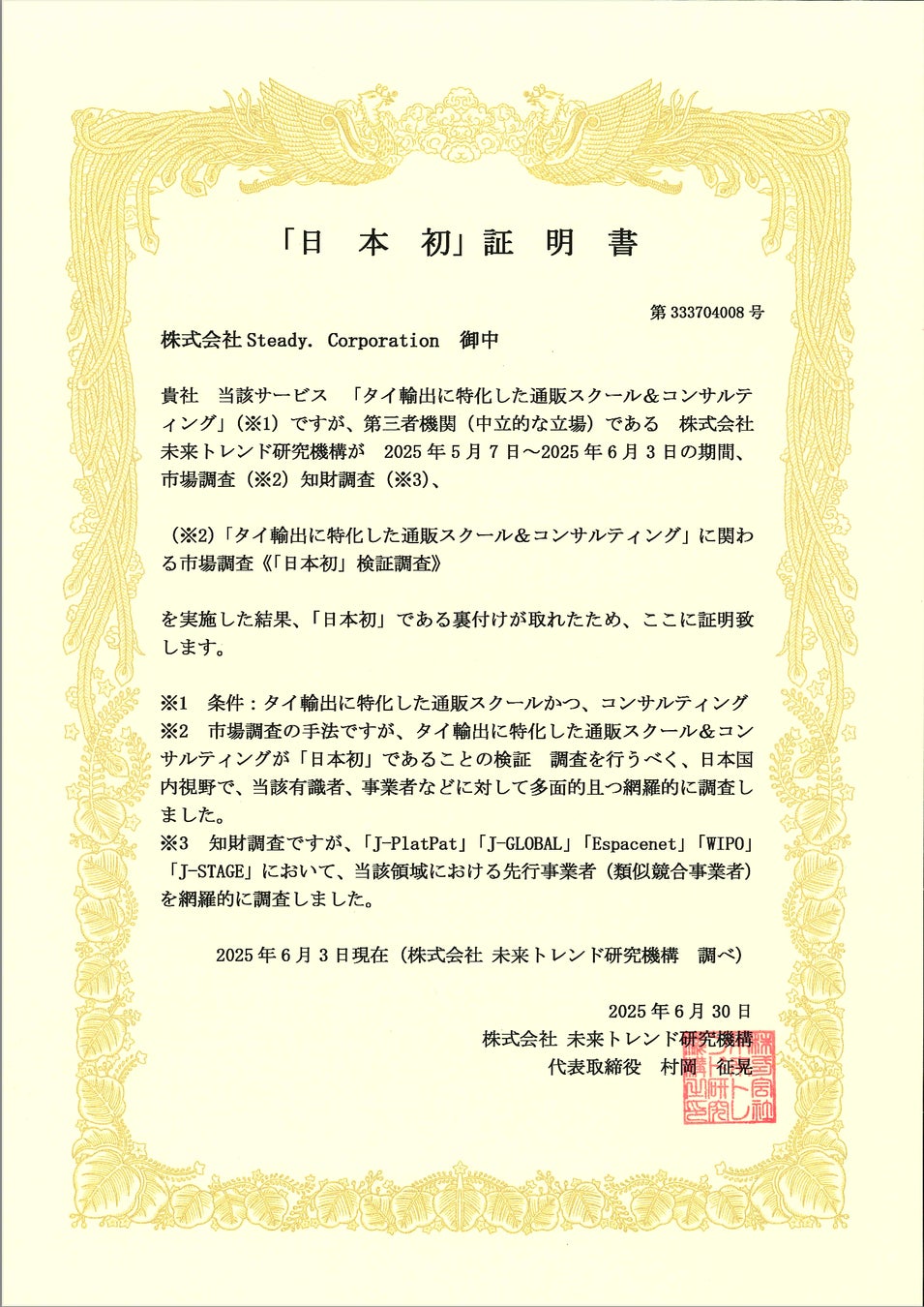 株式会社Steady. Corporation(三山純)と、タイ貿易コンサルタント篠崎大輔氏が共同で展開する海外輸出ビジネス『円安×AI』式 タイ輸出通販プロジェクトが、株式会社未来トレンド研究機構の正式調査により、「日本初」かつ「業界No.1」の称号を獲得しました。
