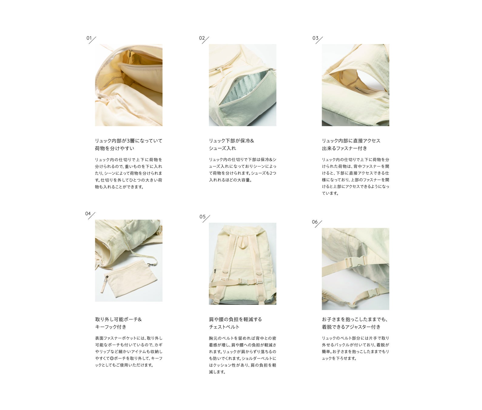 シンプルなのに機能的、どんなスタイルにもフィットするデザインは、日々変化するママたちの生活にぴったり。