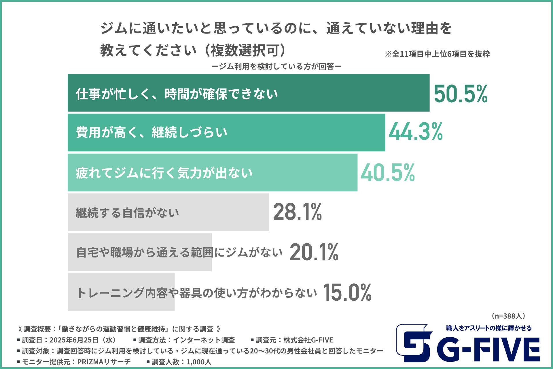 ジムに通えていない主な理由として、時間的な制約と経済的な負担が上位になりました。