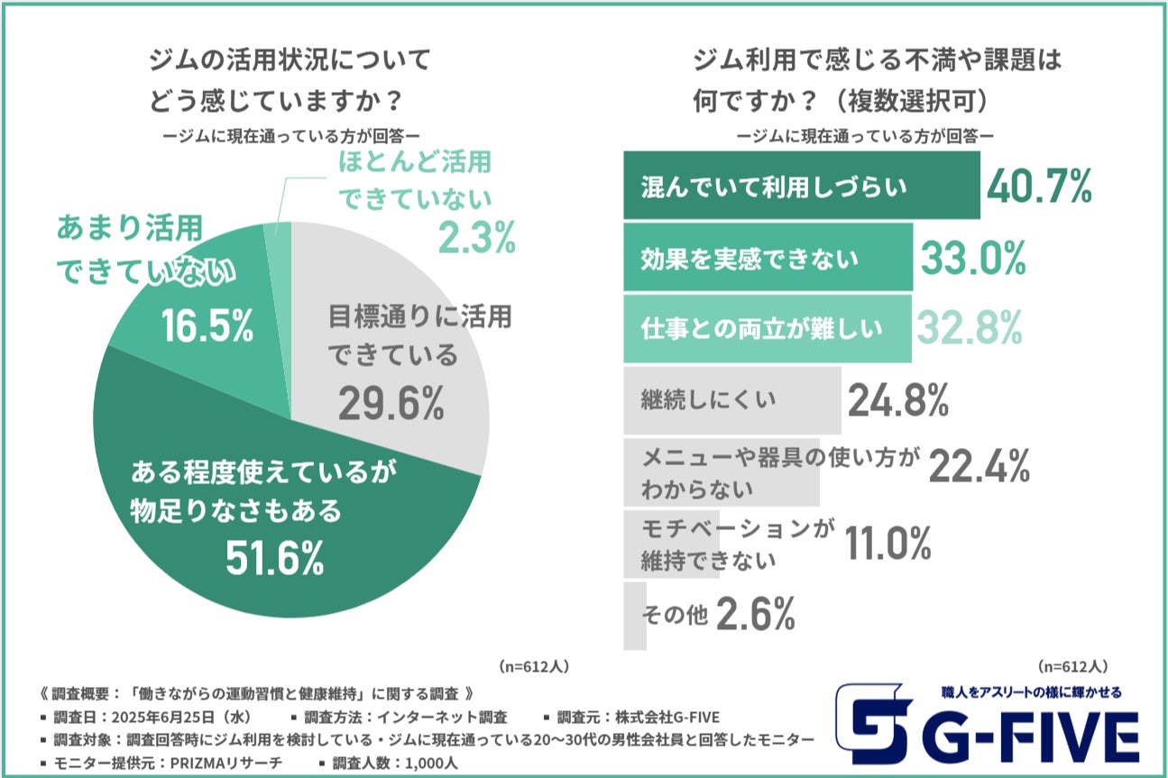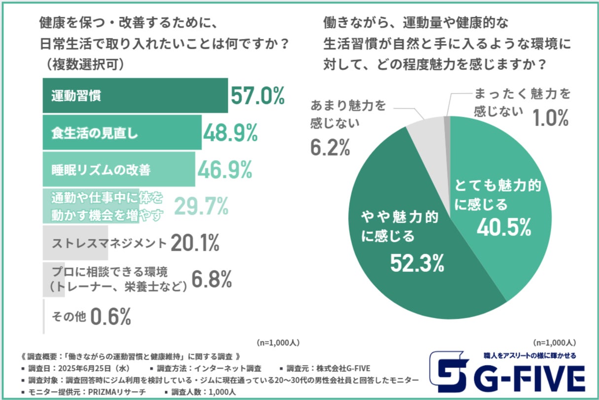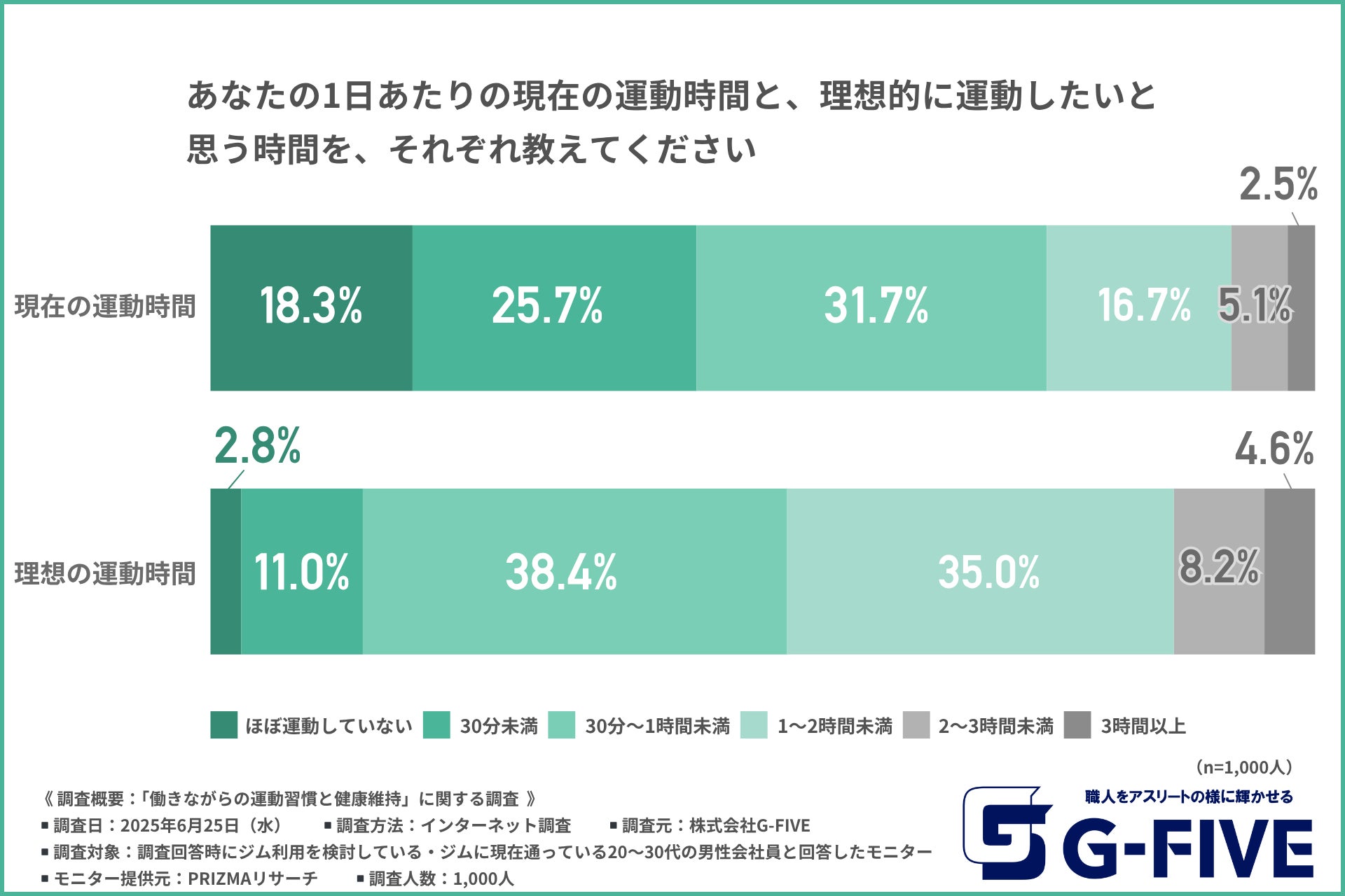 株式会社G-FIVE(所在地:静岡県富士市、代表取締役:岩邊 大樹)は、ジム利用を検討している・ジムに現在通っている20~30代の男性会社員を対象に、「働きながらの運動習慣と健康維持」に関する調査を実施しました。