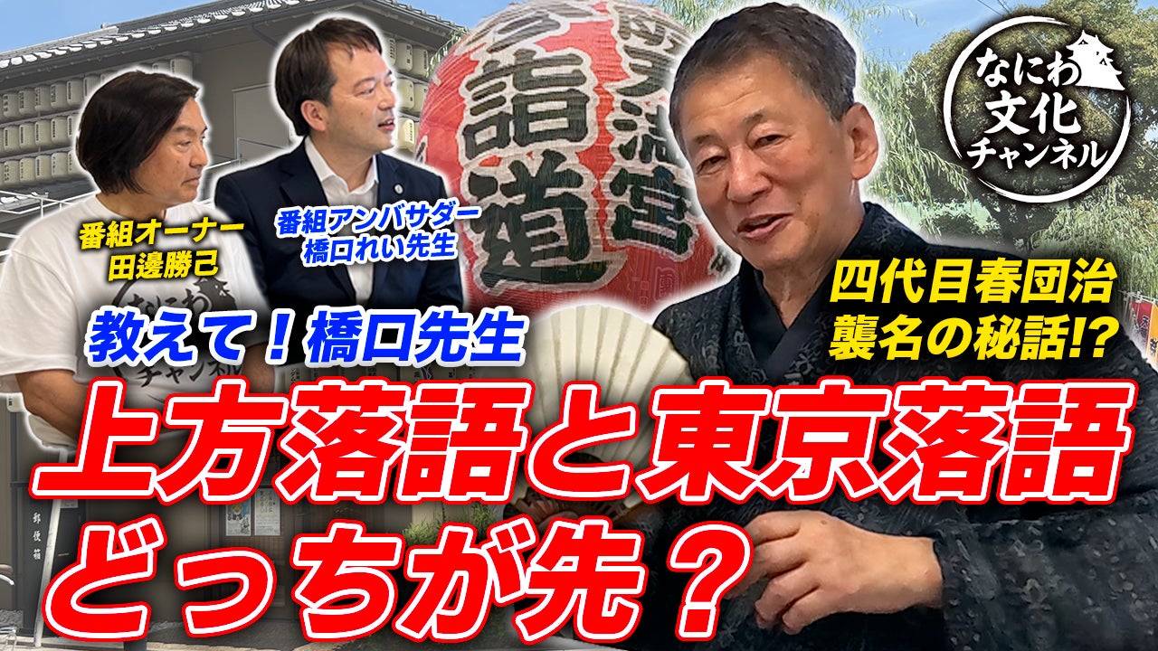 田邊勝己(番組プロデューサー)と橋口れい先生(番組ゲスト・アンバサダー)が出演するトークバラエティ番組『なにわ文化チャンネル』 教えて!橋口れい先生「上方落語と東京落語どっちが先?」が、 YouTube「なにわ文化チャンネル」にて7月10日(木)より配信開始。初回は、大阪・天満天神繁昌亭の提供により、桂 春団治(四代目)師匠との対談企画が実現。