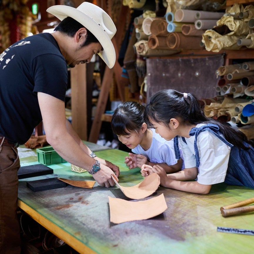 選んだ革に彫刻し、縫い合わせ、磨くことでオリジナルの革小物をつくるレザークラフト体験。