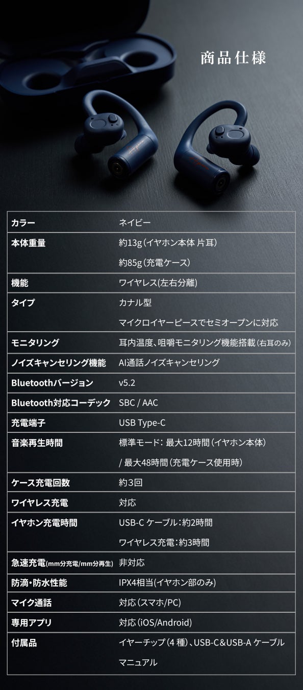 本製品は、業界で初めて※1、イヤホンにAIセンサーを内蔵し、耳から咀嚼筋の動きを検出。回数・強さ・テンポといった噛み方のデータを自然に可視化できる、まったく新しいヒアラブルデバイスです。