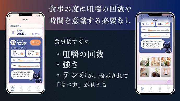 専用のスマホアプリと連動。タイムリーに咀嚼の履歴データを確認して食べ方をセルフチェック。