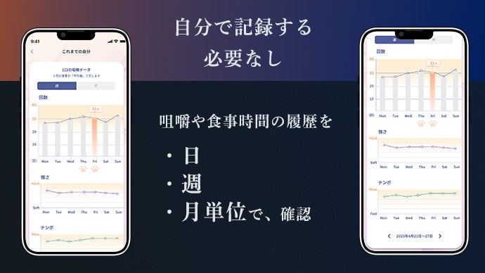 検出した咀嚼データは、専用のスマホアプリに日・週・月単位で記録・蓄積。見たい時にスムーズに見やすいグラフで閲覧でき、自分で記録する必要もありません。スマートに可視化されたデータを見れば、食事の摂り方や噛み方の傾向をセルフチェックに生かせます。