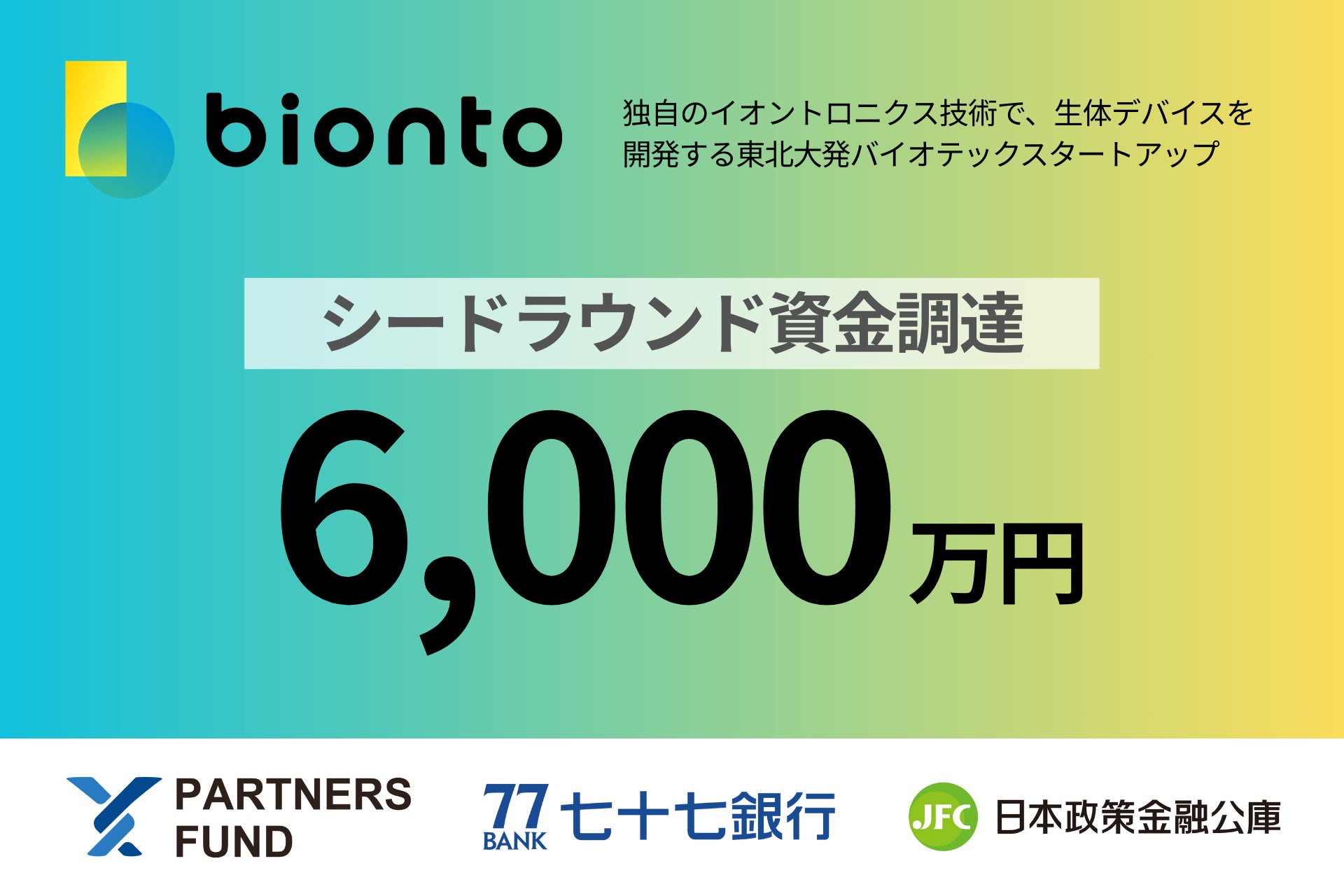 独自の生体イオントロニクス技術で医療とヘルスケアの未来を創造する東北大発バイオテックスタートアップ株式会社bionto(本社:宮城県仙台市、代表取締役:妹尾 浩充、以下「ビオント」)は、シードラウンドにおいて、PARTNERS FUND(本社:東京都渋谷区、代表パートナー:山田 優大、中村 雅人、種市 亮、藤井 智史)を引受先とするJ-KISS型新株予約権による資金調達と日本政策金融公庫及び七十七銀行からの創業融資と合わせて、総額6,000万円の資金調達を実施いたしましたことをお知らせいたします。