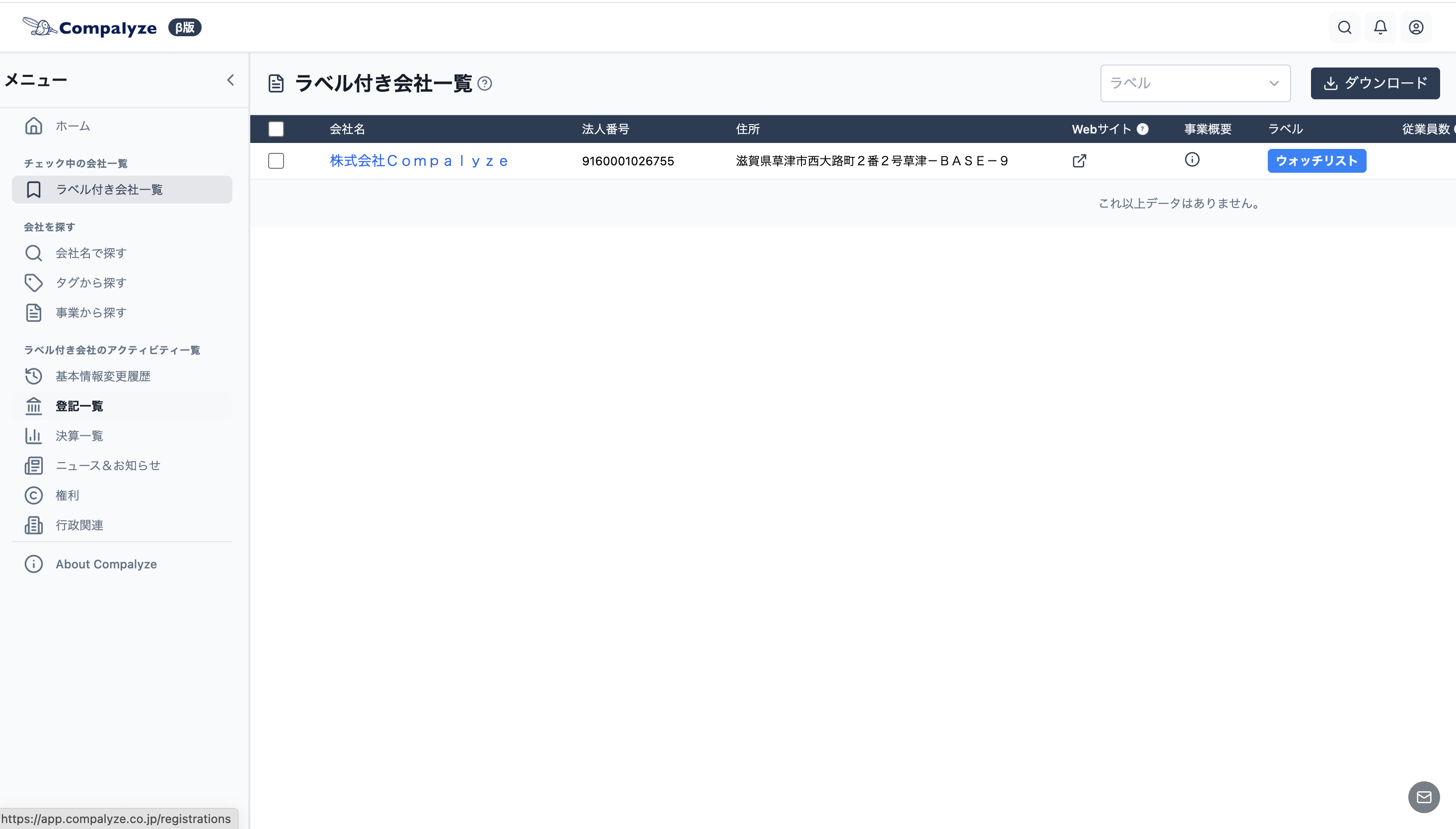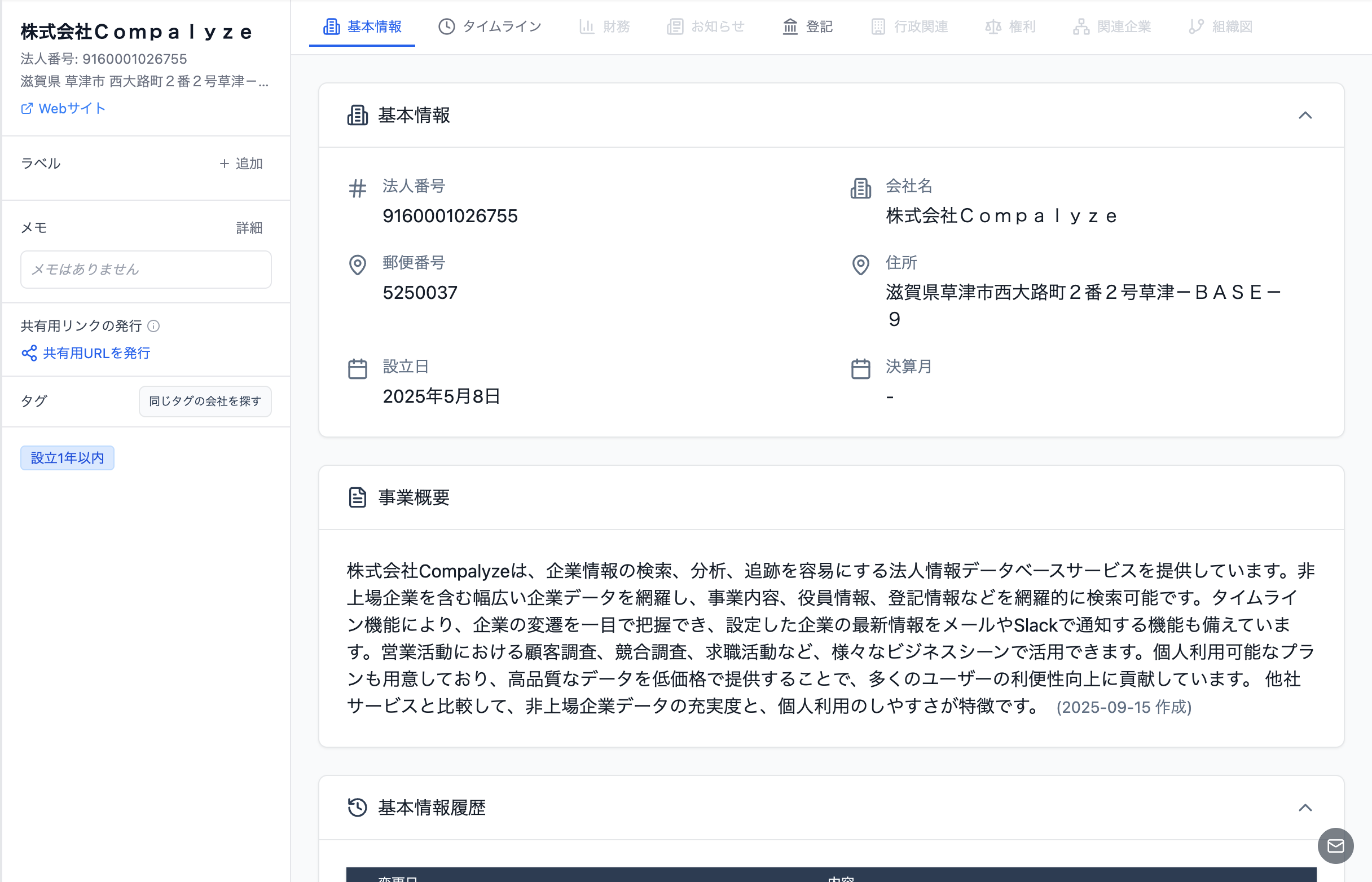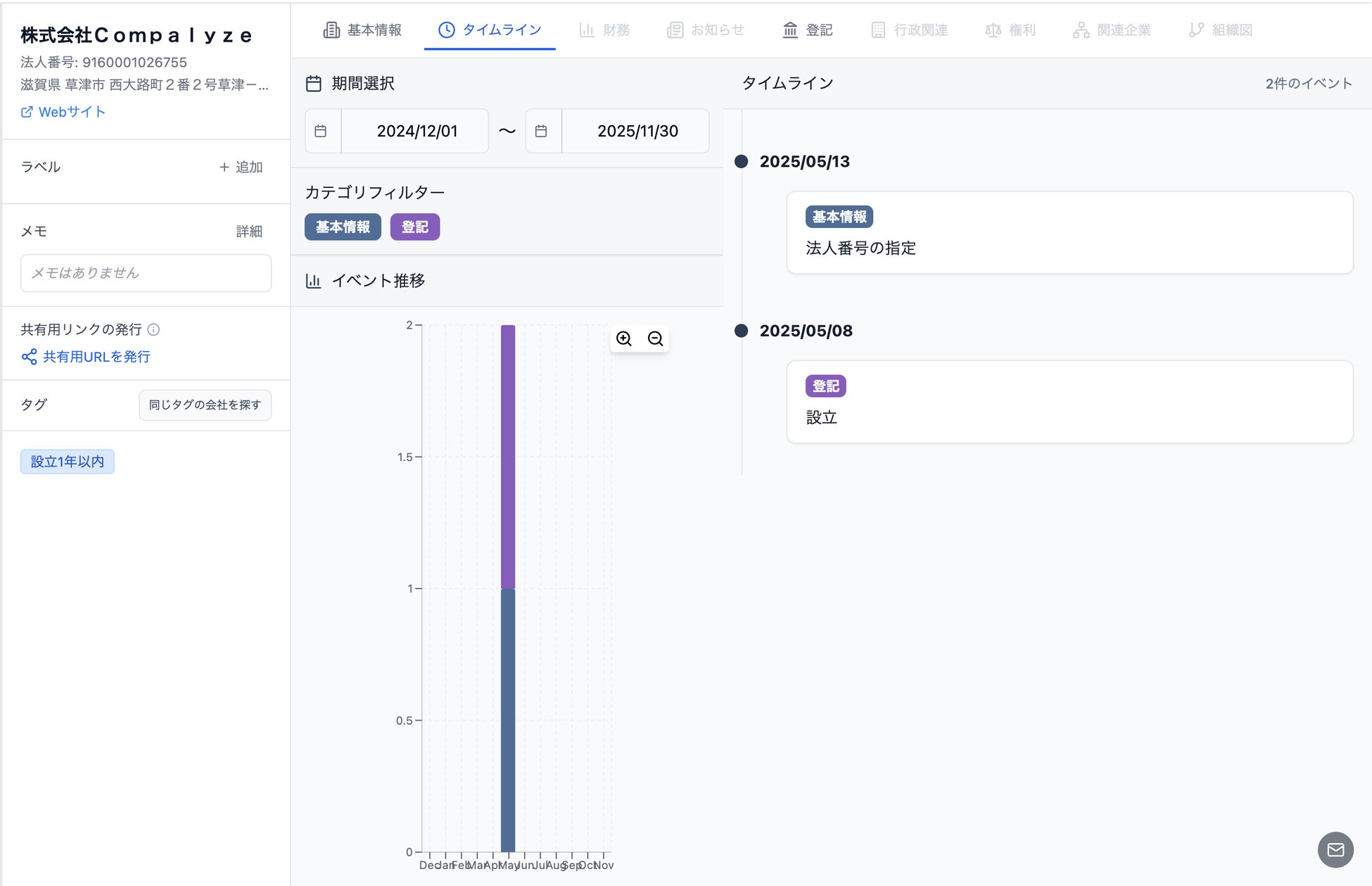 株式会社Compalyze(本社:滋賀県草津市西大路町、代表取締役:鈴木 隆士)は、登記情報や決算公告、プレスリリースなどの一次情報をもとに、企業の動きを時系列で整理・可視化する法人データベース「Compalyze(カンパライズ)」(URL:https://www.compalyze.co.jp/)を正式リリースいたしました。