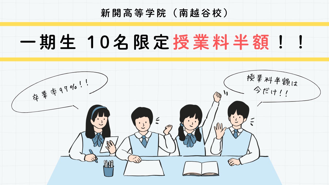 埼玉県越谷市(南越谷駅)に新たに開校した通信制高校サポート校「新開高等学院」(運営:株式会社テトリオ、代表:乗松拓弥)は、2025年度の1期生を対象に授業料半額キャンペーンを実施することを発表いたします。