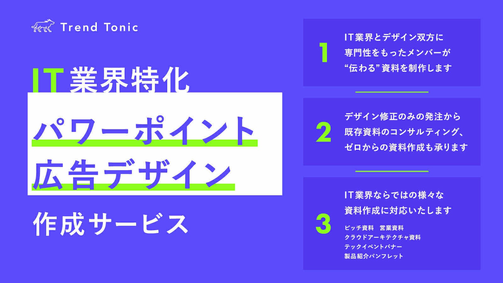 トレンドトニックでは、企業のブランド価値を高めるための資料・広告デザイン作成支援にも注力しています。プレゼンテーション資料の新規作成や既存資料のデザイン修正に加え、ロゴ制作、広告・ポスターなどのビジュアルデザインも対応可能です。