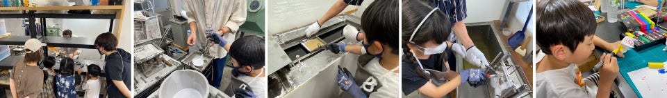 ソフビの制作体験は、大人・こども共同で行います。写真右から①まずは職人さんの技を見学②原材料を金型に流し込む③油の入ったバスユニットで原材料を固める④【ここが快感ポイント】やわらかいうちに金型からパーツを抜く⑤余分な部分を削り取り、パーツを組み立ててから自由にペイント。