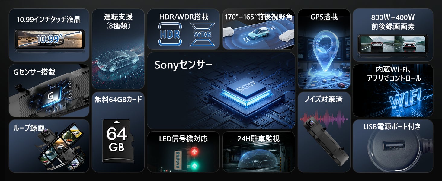 2025年7月11日、日本市場向けに4K前後録画対応のドライブレコーダー「K5」を発売予定です。このデバイスは、11インチのタッチスクリーンを搭載したデジタルミラー型で、前後のカメラは800万画素と400万画素で録画、Sony IMX335センサーとHDR/WDRナイトビジョン機能を備えています。また、8種類の運転支援機能を搭載し、無料の64GB SDカードが付属します。
