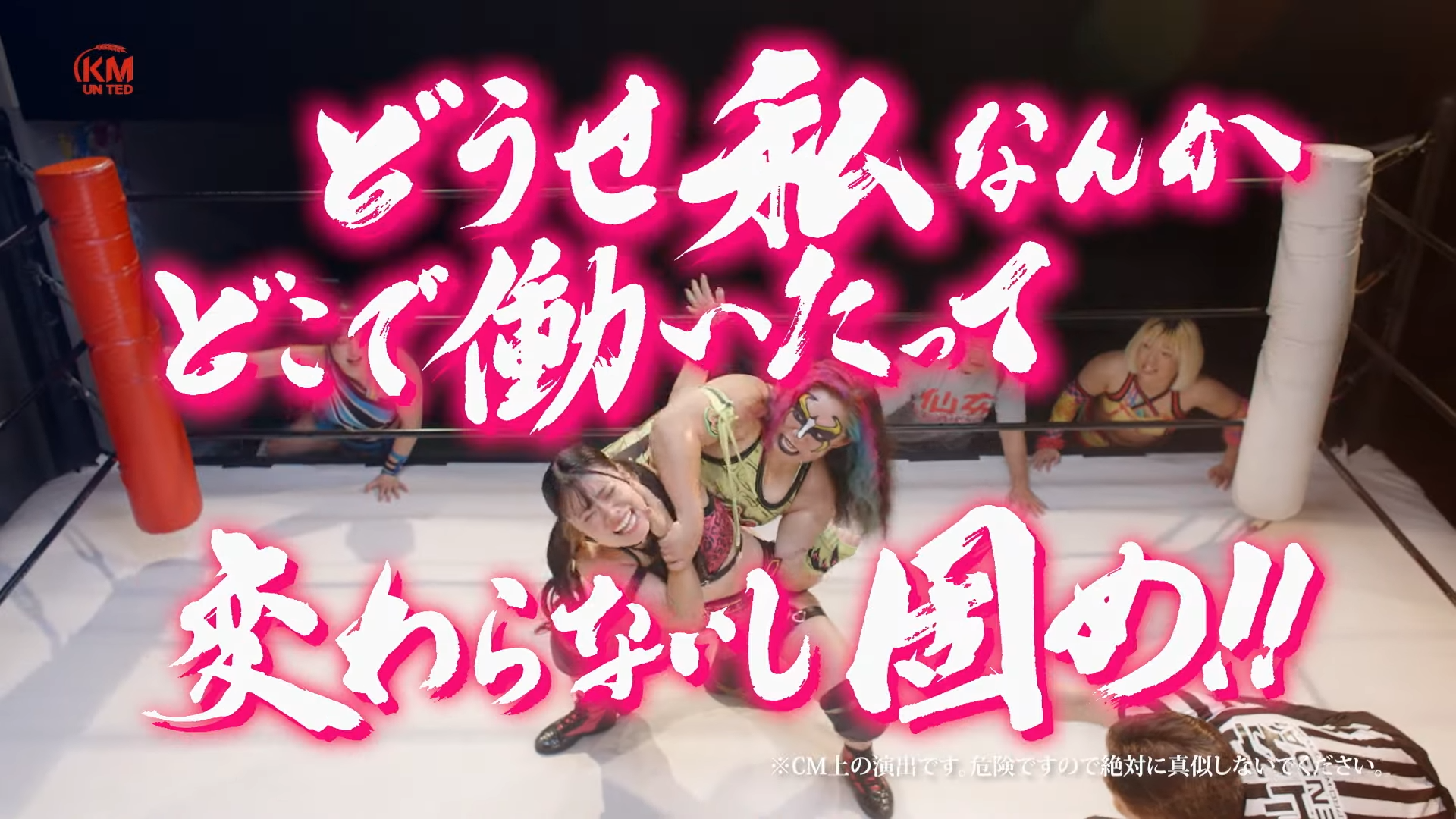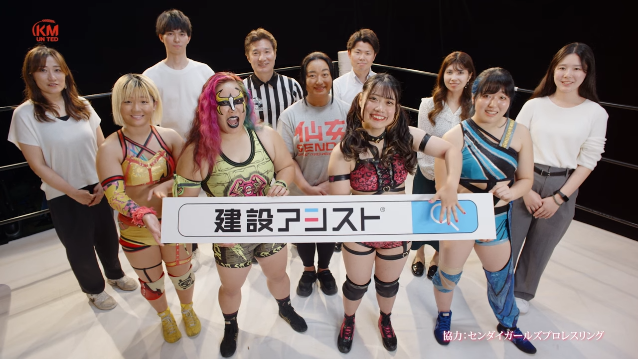 株式会社KMユナイテッド(代表取締役社長:竹延幸雄)は、建設現場の書類業務をアウトソーシングする「建設アシスト」のコマーシャルを制作。7月1日より、TVerにて東京・大阪地区で幅広くオンエアします。出演するのは、センダイガールズプロレスリングの本物のレスラーたち。他にもオペラのプロ、書道のプロ、スポーツライターのプロ(レフェリー役)などが集まり、「夢にチャレンジする」ことの迫力が浮かび上がる仕上がりになっています。世の中の決めつけや、同調圧力によって、活躍の場が見いだせない、挑戦権すら与えられない。そんな不条理な圧力をプロレス技「どうせ私なんか固め」などに重ねて、「世の中 V.S.わたし」の一本勝負を展開。本人が大技「建設アシスト」で逆転勝ちをおさめる、というストーリーです。KMユナイテッドの「建設アシスト」は、サテライトオフィスから、建設現場の書類業務をリモートで支援する仕事。やる気さえあれば誰でも「技(スキル)」を身につけることができて、しかも「建設現場の人手不足」という世の中の問題にも貢献できる、新しいお仕事なのです。このコマーシャルを通じて、たくさんの「挑戦者」が立ち上がり、世の中が動き始めることを願っています。