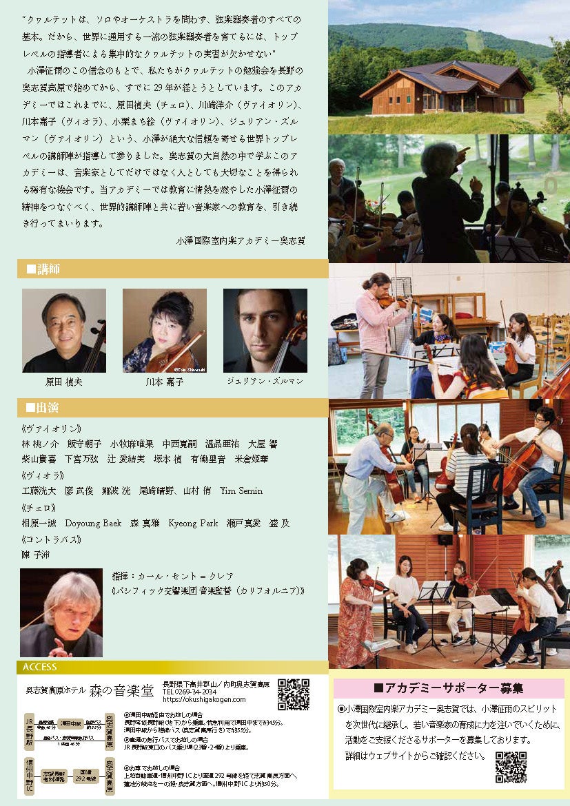 マン(ヴァイオリン)という、小澤が絶大な信頼を寄せる世界トップレベルの講師陣が指導して参りました。奥志賀の大自然の中で学ぶこのアカデミーは、音楽家としてだけではなく人としても大切なことを得られる稀有な機会です。当アカデミーでは教育に情熱を燃やした小澤征爾の精神をつなぐべく、世界的講師陣と共に若い音楽家への教育を、引き続き行ってまいります。